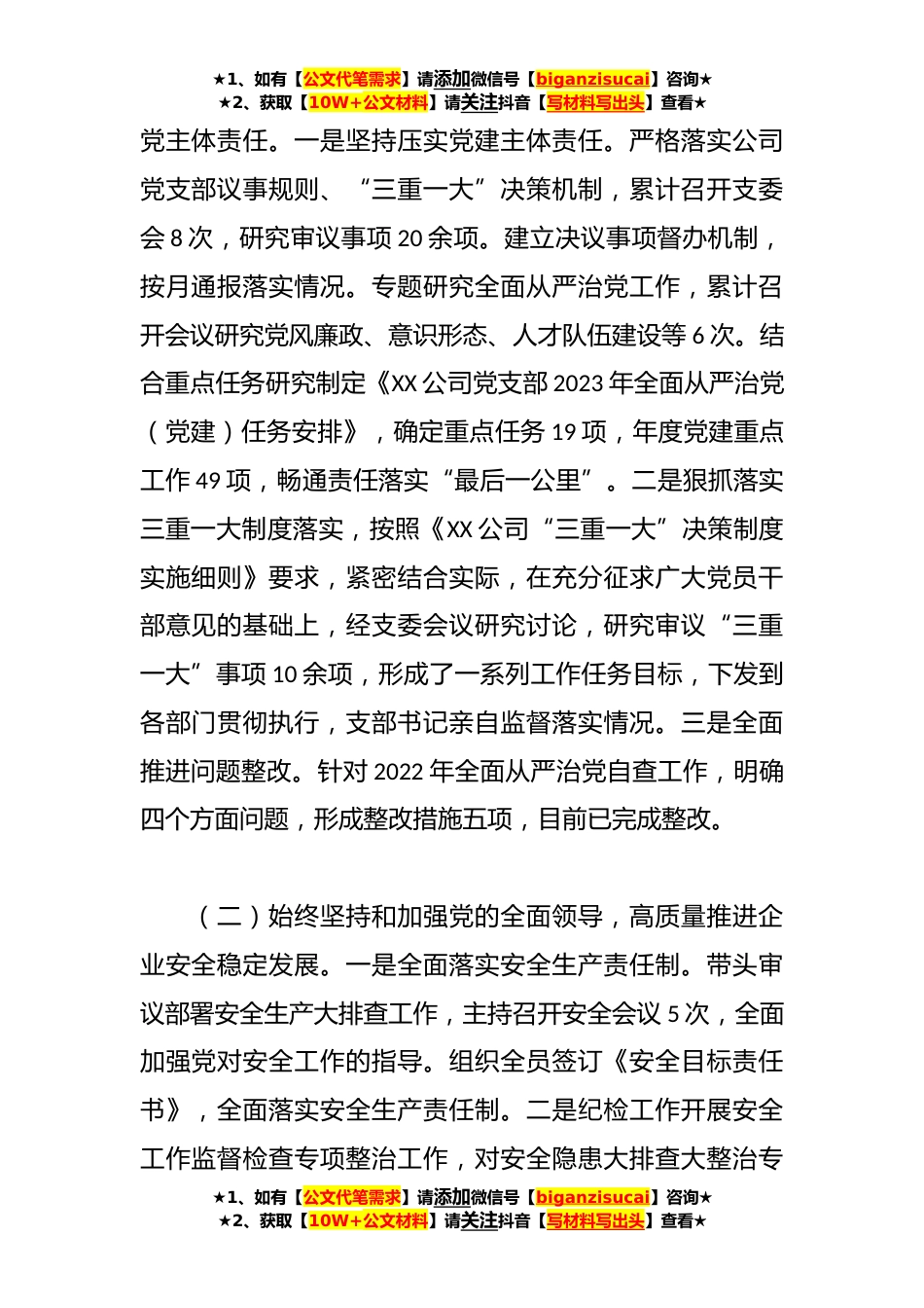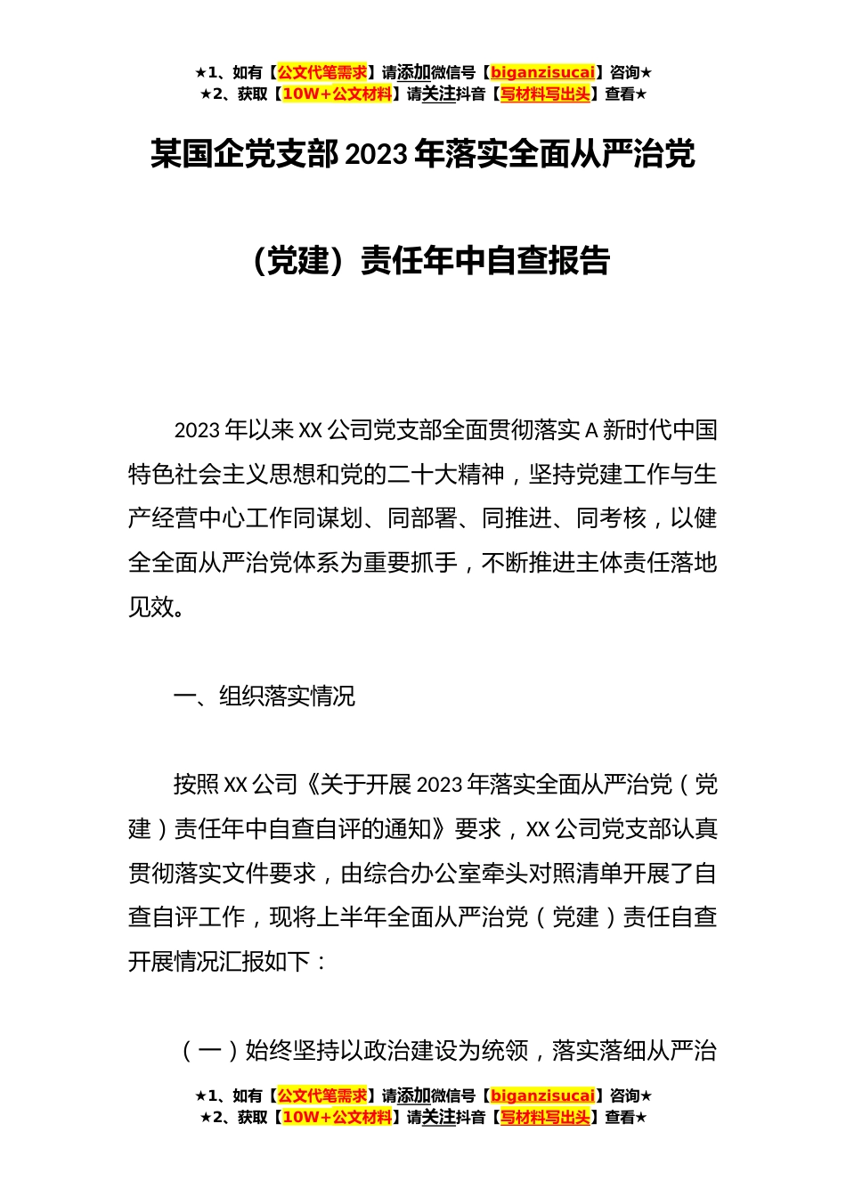 ★1、如有【公文代笔需求】请添加微信号【biganzisucai】咨询★★2、获取【10W+公文材料】请关注抖音【写材料写出头】查看★某国企党支部2023年落实全面从严治党(党建)责任年中自查报告2023年以来XX公司党支部全面贯彻落实A新时代中国特色社会主义思想和党的二十大精神,坚持党建工作与生产经营中心工作同谋划、同部署、同推进、同考核,以健全全面从严治党体系为重要抓手,不断推进主体责任落地见效。一、组织落实情况按照XX公司《关于开展2023年落实全面从严治党(党建)责任年中自查自评的通知》要求,XX公司党支部认真贯彻落实文件要求,由综合办公室牵头对照清单开展了自查自评工作,现将上半年全面从严治党(党建)责任自查开展情况汇报如下:(一)始终坚持以政治建设为统领,落实落细从严治★1、如有【...