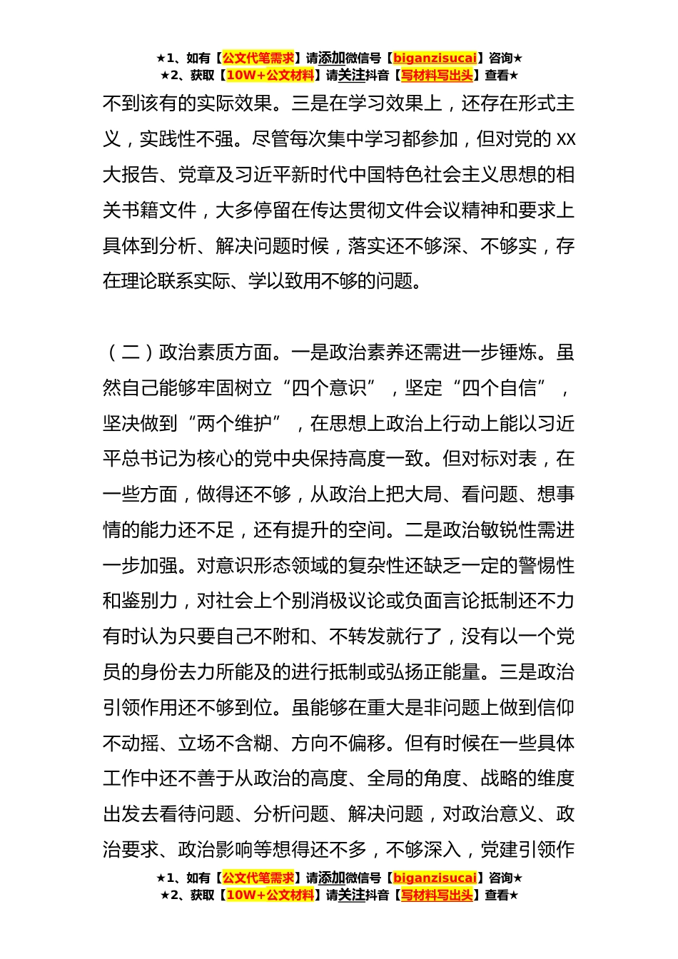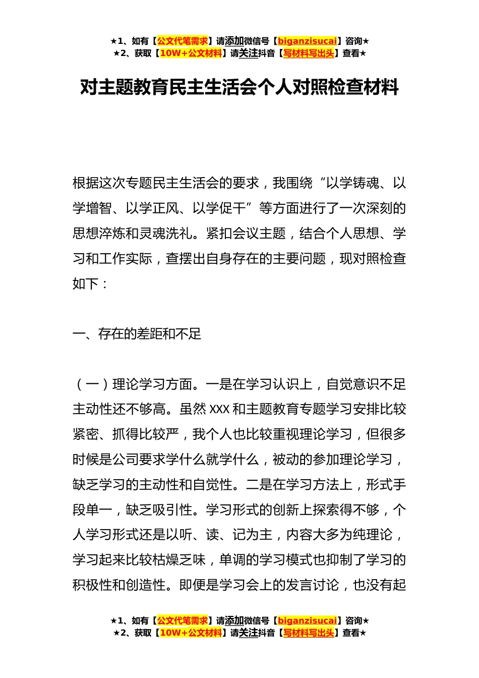 ★1、如有【公文代笔需求】请添加微信号【biganzisucai】咨询★★2、获取【10W+公文材料】请关注抖音【写材料写出头】查看★对主题教育民主生活会个人对照检查材料根据这次专题民主生活会的要求,我围绕“以学铸魂、以学增智、以学正风、以学促干”等方面进行了一次深刻的思想淬炼和灵魂洗礼。紧扣会议主题,结合个人思想、学习和工作实际,查摆出自身存在的主要问题,现对照检查如下:一、存在的差距和不足(一)理论学习方面。一是在学习认识上,自觉意识不足主动性还不够高。虽然XXX和主题教育专题学习安排比较紧密、抓得比较严,我个人也比较重视理论学习,但很多时候是公司要求学什么就学什么,被动的参加理论学习,缺乏学习的主动性和自觉性。二是在学习方法上,形式手段单一,缺乏吸引性。学习形式的创新上...