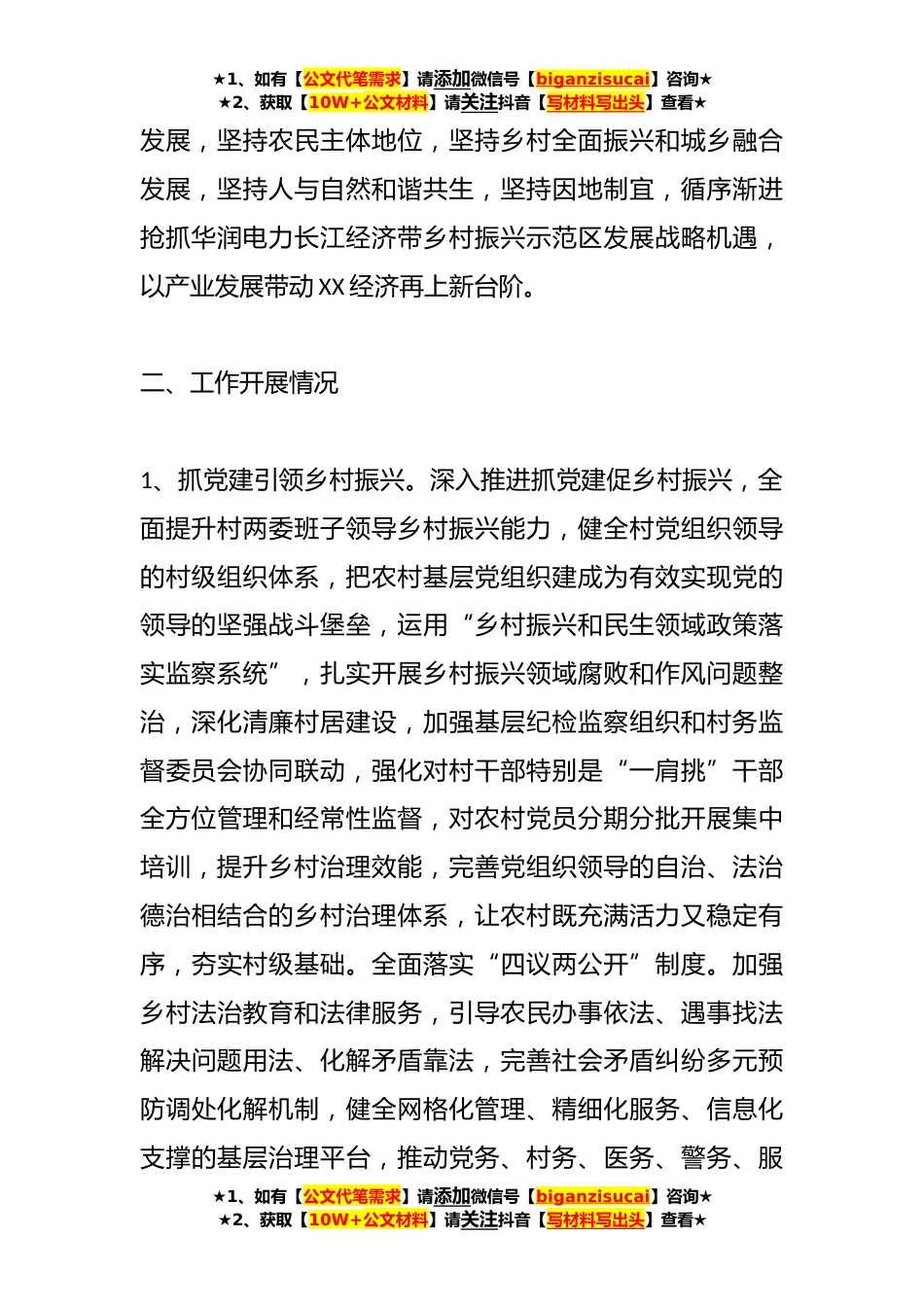 ★1、如有【公文代笔需求】请添加微信号【biganzisucai】咨询★★2、获取【10W+公文材料】请关注抖音【写材料写出头】查看★2023年某开发区上半年乡村振兴工作总结为全面贯彻落实习近平总书记关于巩固拓展脱贫攻坚与乡村振兴有效衔接的重要讲话精神,抢抓华润电力长江经济带乡村振兴示范区发展战略机遇,结合“XX市关于高质量发展建设共同富裕示范市行动计划”,我区以“生态优先绿色发展”为主线,提升产业发展带动农民增产增收,推动XX经济社会全面进步,稳步推进2023年乡村振兴各项工作,现就工作开展情况汇报如下:一、基本情况XX开发区地处XX市西南,距京珠高速和107国道35公里,距三国古战场和长江黄金水道8公里,XX长江公路大桥穿境而过,交通条件得天独厚。东、北与XX镇相连,南与余家桥乡相接,西与黄盖...