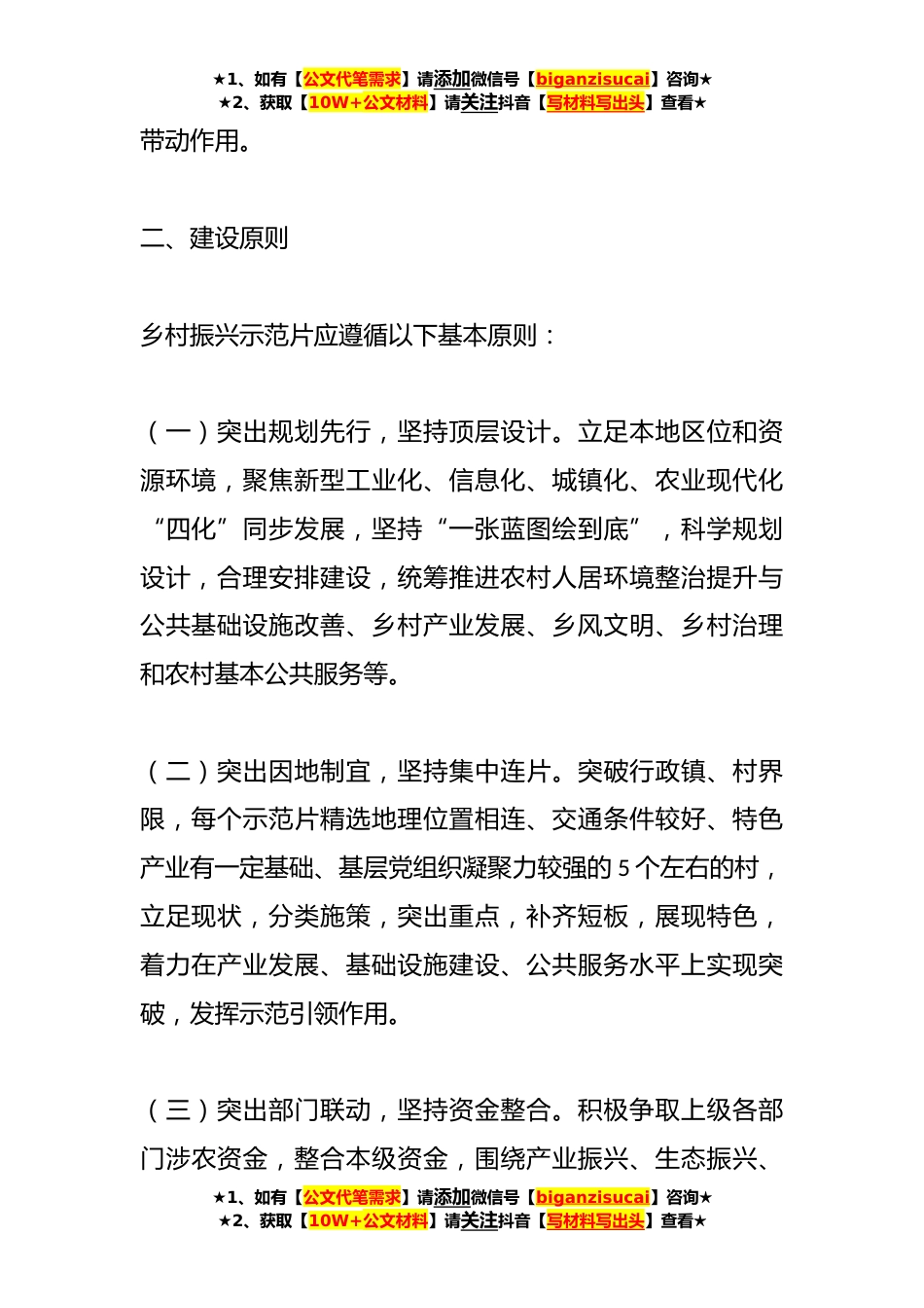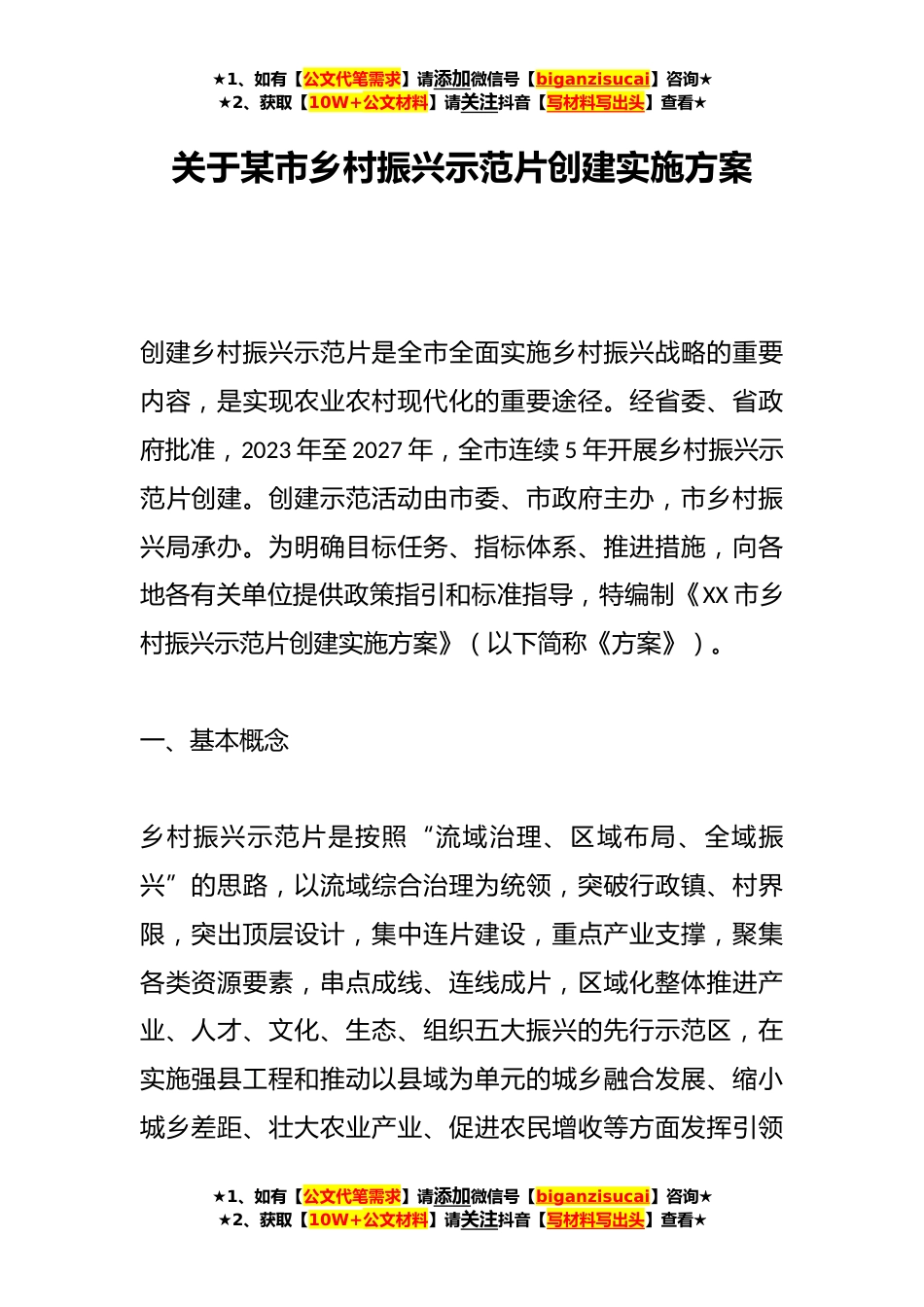 ★1、如有【公文代笔需求】请添加微信号【biganzisucai】咨询★★2、获取【10W+公文材料】请关注抖音【写材料写出头】查看★关于某市乡村振兴示范片创建实施方案创建乡村振兴示范片是全市全面实施乡村振兴战略的重要内容,是实现农业农村现代化的重要途径。经省委、省政府批准,2023年至2027年,全市连续5年开展乡村振兴示范片创建。创建示范活动由市委、市政府主办,市乡村振兴局承办。为明确目标任务、指标体系、推进措施,向各地各有关单位提供政策指引和标准指导,特编制《XX市乡村振兴示范片创建实施方案》(以下简称《方案》)。一、基本概念乡村振兴示范片是按照“流域治理、区域布局、全域振兴”的思路,以流域综合治理为统领,突破行政镇、村界限,突出顶层设计,集中连片建设,重点产业支撑,聚集各类资...