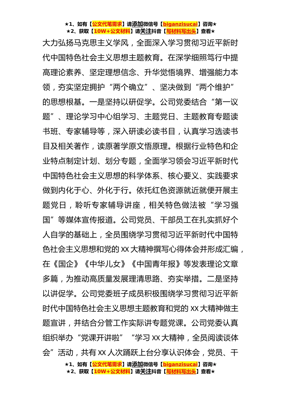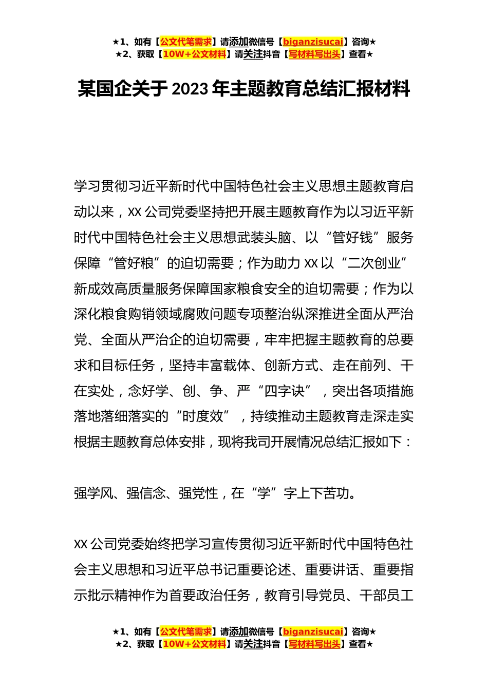 ★1、如有【公文代笔需求】请添加微信号【biganzisucai】咨询★★2、获取【10W+公文材料】请关注抖音【写材料写出头】查看★某国企关于2023年主题教育总结汇报材料学习贯彻习近平新时代中国特色社会主义思想主题教育启动以来,XX公司党委坚持把开展主题教育作为以习近平新时代中国特色社会主义思想武装头脑、以“管好钱”服务保障“管好粮”的迫切需要;作为助力XX以“二次创业”新成效高质量服务保障国家粮食安全的迫切需要;作为以深化粮食购销领域腐败问题专项整治纵深推进全面从严治党、全面从严治企的迫切需要,牢牢把握主题教育的总要求和目标任务,坚持丰富载体、创新方式、走在前列、干在实处,念好学、创、争、严“四字诀”,突出各项措施落地落细落实的“时度效”,持续推动主题教育走深走实根据主题教...