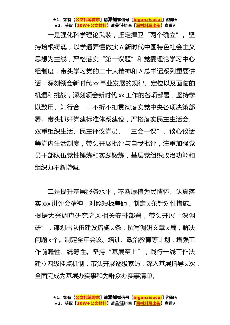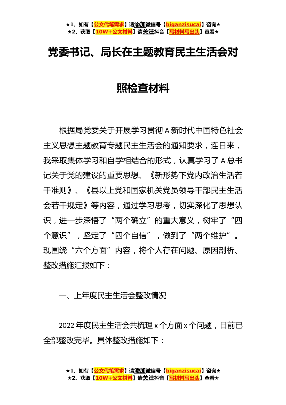 ★1、如有【公文代笔需求】请添加微信号【biganzisucai】咨询★★2、获取【10W+公文材料】请关注抖音【写材料写出头】查看★党委书记、局长在主题教育民主生活会对照检查材料根据局党委关于开展学习贯彻A新时代中国特色社会主义思想主题教育专题民主生活会的通知要求,连日来,我采取集体学习和自学相结合的形式,认真学习了A总书记关于党的建设的重要思想、《新形势下党内政治生活若干准则》、《县以上党和国家机关党员领导干部民主生活会若干规定》等内容,通过学习思考,切实深化了思想认识,进一步深悟了“两个确立”的重大意义,树牢了“四个意识”,坚定了“四个自信”,做到了“两个维护”。现围绕“六个方面”内容,将个人存在问题、原因剖析、整改措施汇报如下:一、上年度民主生活会整改情况2022年度民...