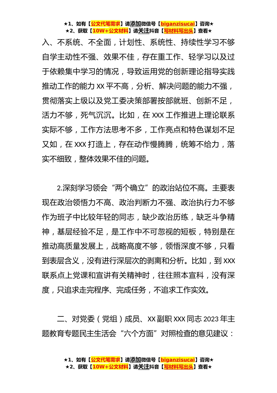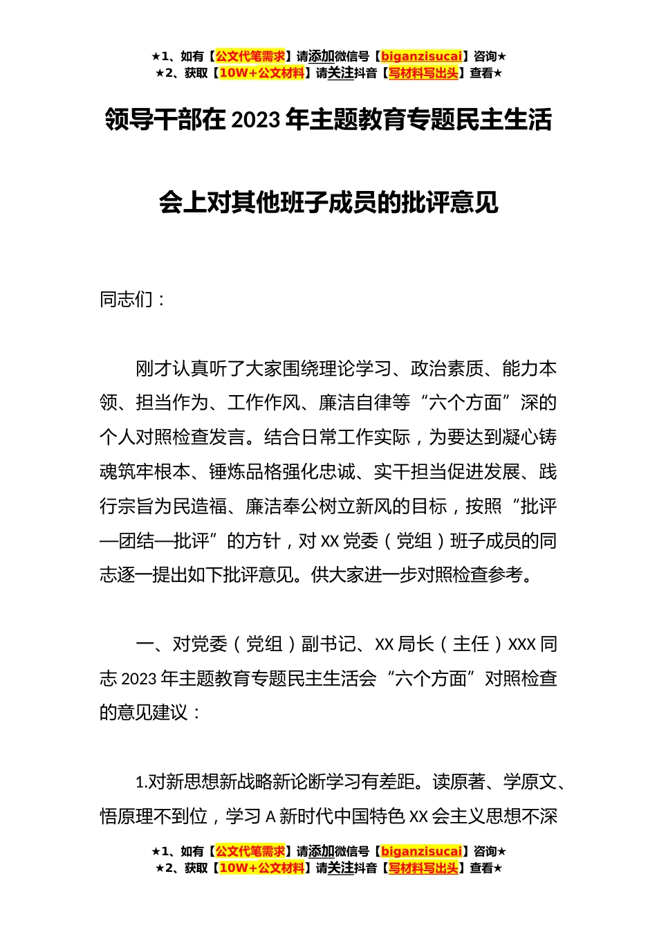 ★1、如有【公文代笔需求】请添加微信号【biganzisucai】咨询★★2、获取【10W+公文材料】请关注抖音【写材料写出头】查看★领导干部在2023年主题教育专题民主生活会上对其他班子成员的批评意见同志们:刚才认真听了大家围绕理论学习、政治素质、能力本领、担当作为、工作作风、廉洁自律等“六个方面”深的个人对照检查发言。结合日常工作实际,为要达到凝心铸魂筑牢根本、锤炼品格强化忠诚、实干担当促进发展、践行宗旨为民造福、廉洁奉公树立新风的目标,按照“批评—团结—批评”的方针,对XX党委(党组)班子成员的同志逐一提出如下批评意见。供大家进一步对照检查参考。一、对党委(党组)副书记、XX局长(主任)XXX同志2023年主题教育专题民主生活会“六个方面”对照检查的意见建议:1.对新思想新战略新论断...