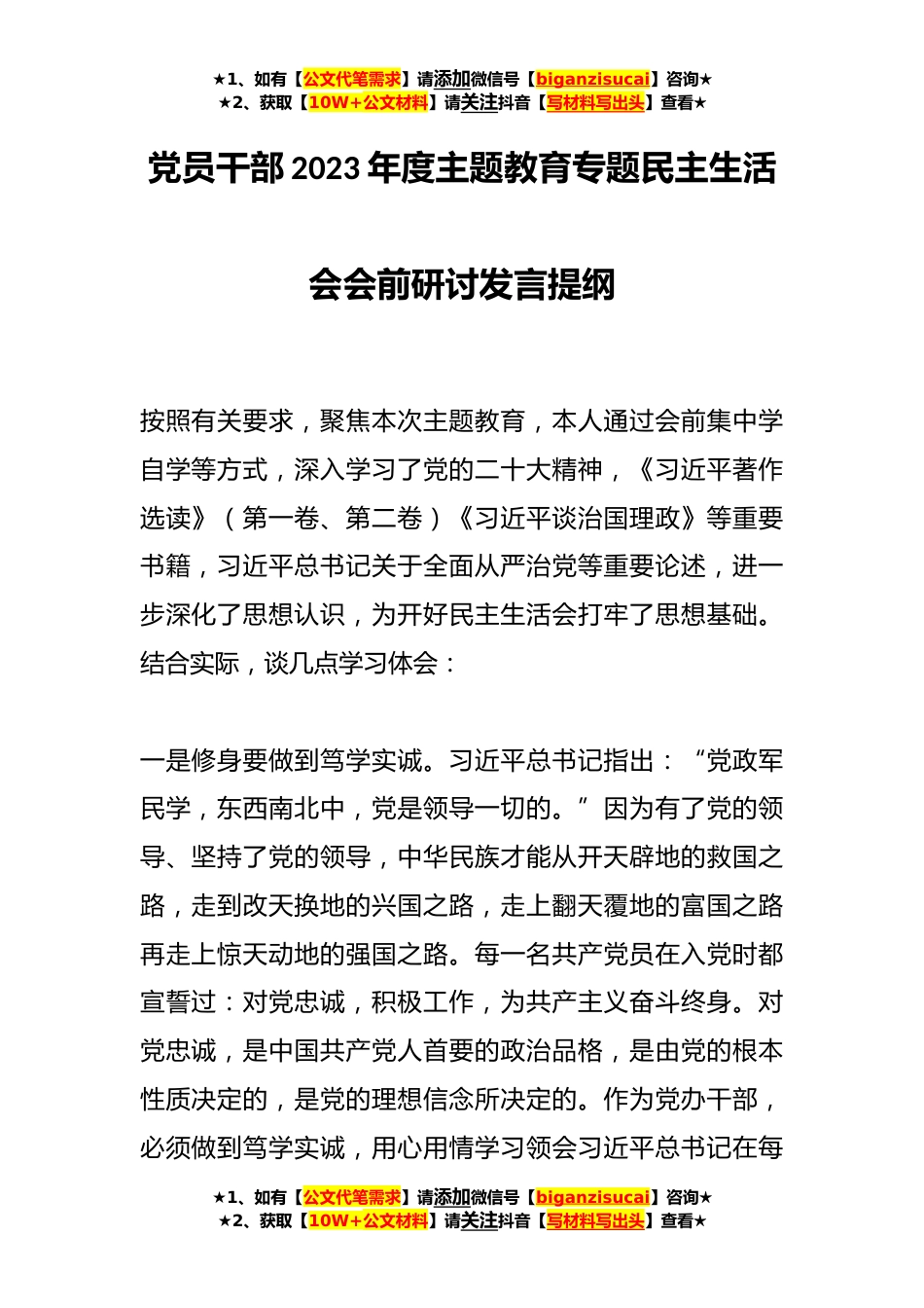 ★1、如有【公文代笔需求】请添加微信号【biganzisucai】咨询★★2、获取【10W+公文材料】请关注抖音【写材料写出头】查看★党员干部2023年度主题教育专题民主生活会会前研讨发言提纲按照有关要求,聚焦本次主题教育,本人通过会前集中学自学等方式,深入学习了党的二十大精神,《习近平著作选读》(第一卷、第二卷)《习近平谈治国理政》等重要书籍,习近平总书记关于全面从严治党等重要论述,进一步深化了思想认识,为开好民主生活会打牢了思想基础。结合实际,谈几点学习体会:一是修身要做到笃学实诚。习近平总书记指出:“党政军民学,东西南北中,党是领导一切的。”因为有了党的领导、坚持了党的领导,中华民族才能从开天辟地的救国之路,走到改天换地的兴国之路,走上翻天覆地的富国之路再走上惊天动地的...