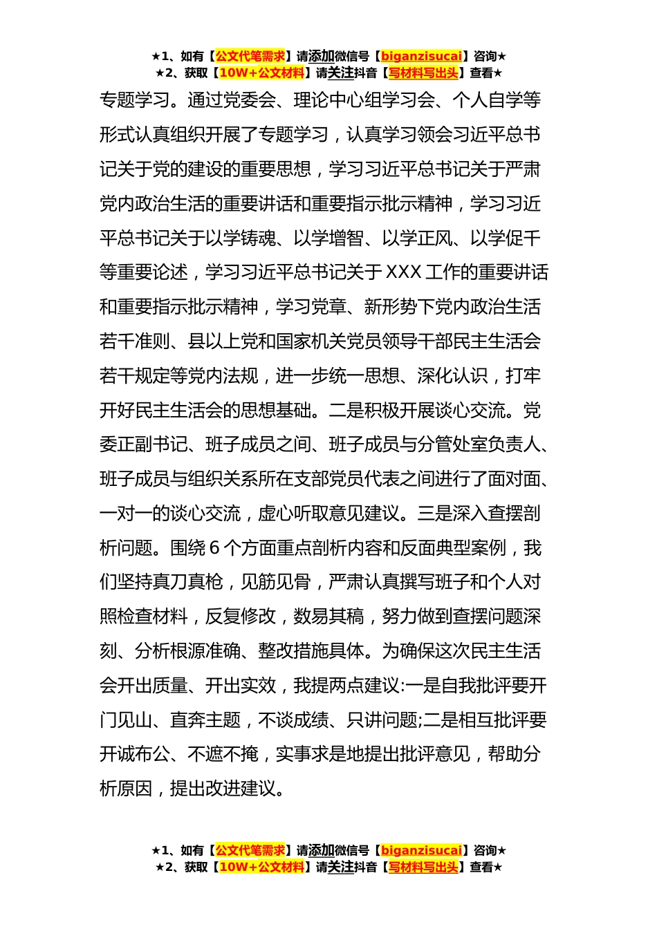 ★1、如有【公文代笔需求】请添加微信号【biganzisucai】咨询★★2、获取【10W+公文材料】请关注抖音【写材料写出头】查看★XX党委2023年度专题民主生活会主持词同志们:按照《关于召开主题教育专题民主生活会的通知》要求,今天我们召开XX党委学习贯彻习近平新时代中国特色社会主义思想主题教育专题民主生活会,局党组对此次会议非常重视,XXX、XXX亲临会议指导,让我们以热烈的学声表示欢迎和感谢!今天会议应到班子成员X名,实到X名,符合规定人数,可以开会。这次民主生活会的主题是:紧紧围绕学习贯彻习近平新时代中国特色社会主义思想主题召开专题民主生活会,聚焦学思想、强党性、重实践、建新功总要求,对照凝心铸魂筑牢根本、锤炼品格强化忠诚、实干担当促进发展、践行宗旨为民造福、廉洁奉公树立新风具体目...