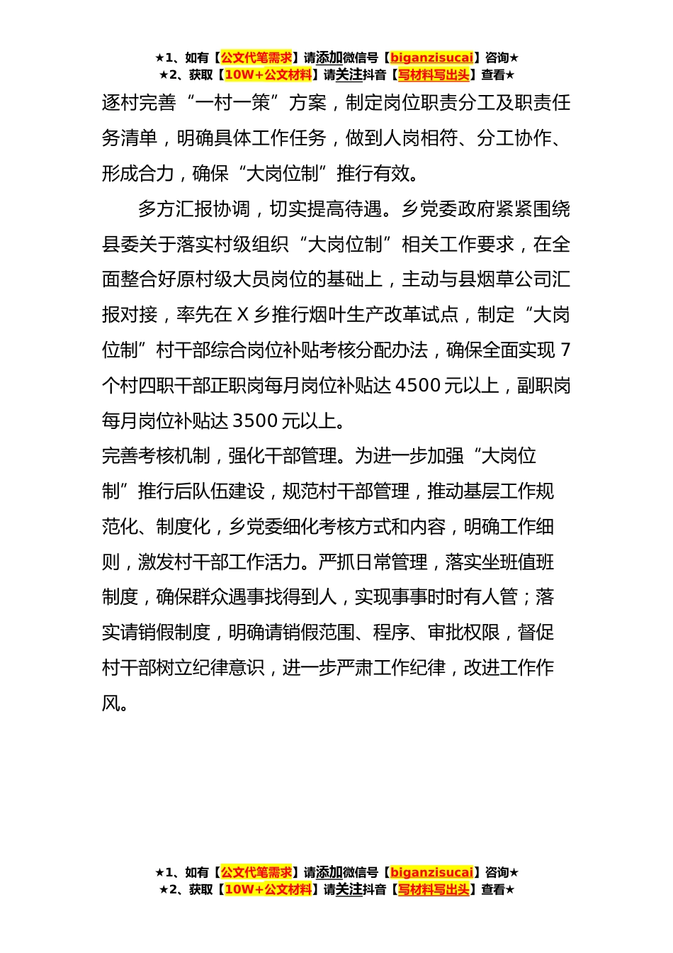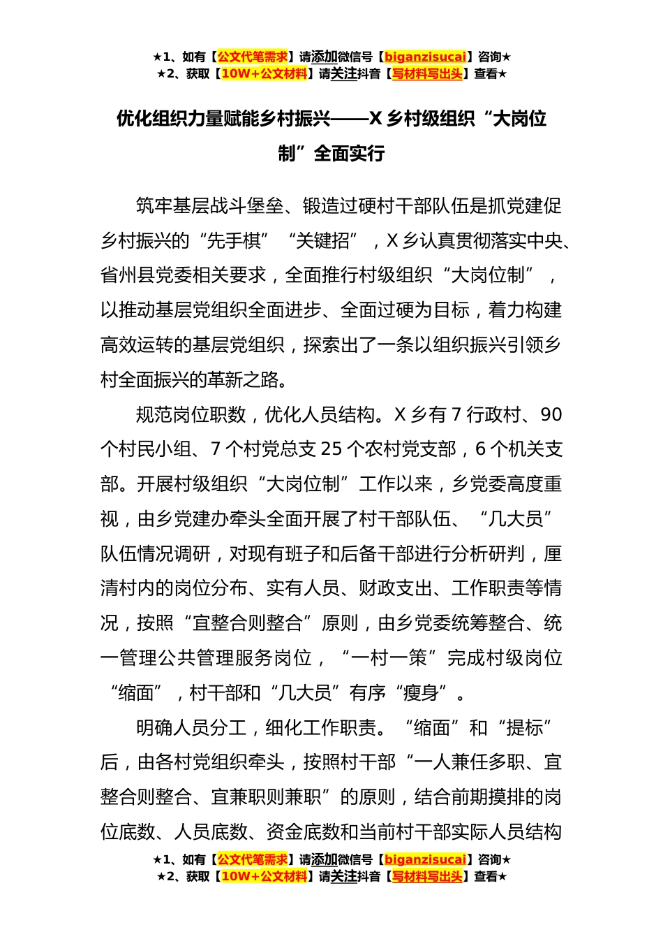 ★1、如有【公文代笔需求】请添加微信号【biganzisucai】咨询★★2、获取【10W+公文材料】请关注抖音【写材料写出头】查看★优化组织力量赋能乡村振兴——X乡村级组织“大岗位制”全面实行筑牢基层战斗堡垒、锻造过硬村干部队伍是抓党建促乡村振兴的“先手棋”“关键招”,X乡认真贯彻落实中央、省州县党委相关要求,全面推行村级组织“大岗位制”,以推动基层党组织全面进步、全面过硬为目标,着力构建高效运转的基层党组织,探索出了一条以组织振兴引领乡村全面振兴的革新之路。规范岗位职数,优化人员结构。X乡有7行政村、90个村民小组、7个村党总支25个农村党支部,6个机关支部。开展村级组织“大岗位制”工作以来,乡党委高度重视,由乡党建办牵头全面开展了村干部队伍、“几大员”队伍情况调研,对现有班子...