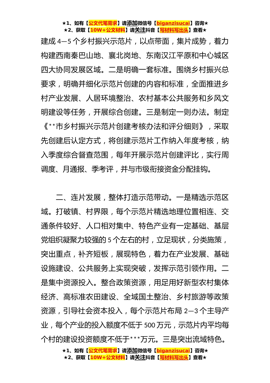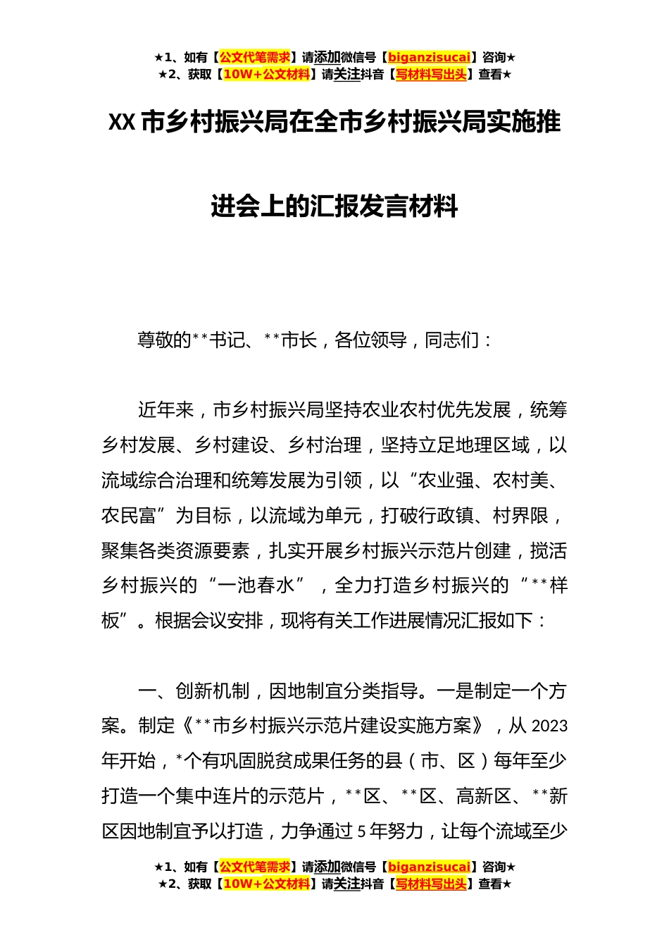 ★1、如有【公文代笔需求】请添加微信号【biganzisucai】咨询★★2、获取【10W+公文材料】请关注抖音【写材料写出头】查看★XX市乡村振兴局在全市乡村振兴局实施推进会上的汇报发言材料尊敬的**书记、**市长,各位领导,同志们:近年来,市乡村振兴局坚持农业农村优先发展,统筹乡村发展、乡村建设、乡村治理,坚持立足地理区域,以流域综合治理和统筹发展为引领,以“农业强、农村美、农民富”为目标,以流域为单元,打破行政镇、村界限,聚集各类资源要素,扎实开展乡村振兴示范片创建,搅活乡村振兴的“一池春水”,全力打造乡村振兴的“**样板”。根据会议安排,现将有关工作进展情况汇报如下:一、创新机制,因地制宜分类指导。一是制定一个方案。制定《**市乡村振兴示范片建设实施方案》,从2023年开始,*个...