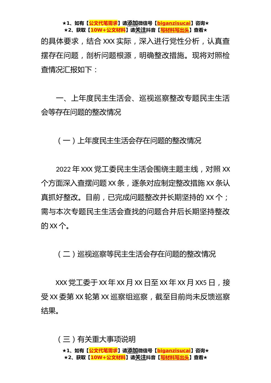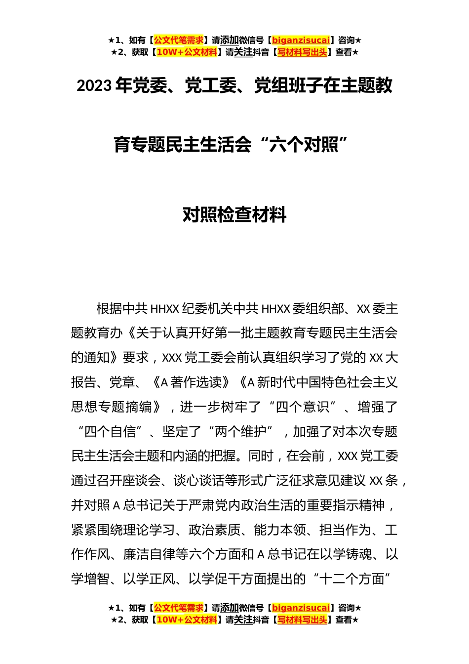 ★1、如有【公文代笔需求】请添加微信号【biganzisucai】咨询★★2、获取【10W+公文材料】请关注抖音【写材料写出头】查看★2023年党委、党工委、党组班子在主题教育专题民主生活会“六个对照”对照检查材料根据中共HHXX纪委机关中共HHXX委组织部、XX委主题教育办《关于认真开好第一批主题教育专题民主生活会的通知》要求,XXX党工委会前认真组织学习了党的XX大报告、党章、《A著作选读》《A新时代中国特色社会主义思想专题摘编》,进一步树牢了“四个意识”、增强了“四个自信”、坚定了“两个维护”,加强了对本次专题民主生活会主题和内涵的把握。同时,在会前,XXX党工委通过召开座谈会、谈心谈话等形式广泛征求意见建议XX条,并对照A总书记关于严肃党内政治生活的重要指示精神,紧紧围绕理论学习、政治素质、...