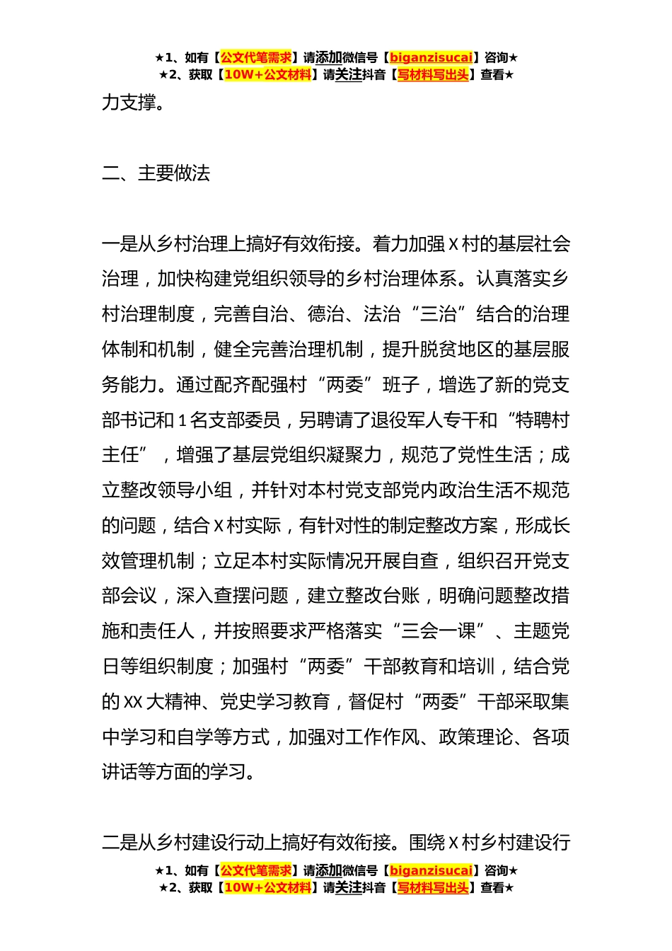 ★1、如有【公文代笔需求】请添加微信号【biganzisucai】咨询★★2、获取【10W+公文材料】请关注抖音【写材料写出头】查看★关于对推进巩固拓展脱贫攻坚成果与乡村振兴有效衔接的调研报告一、引言巩固拓展脱贫攻坚成果与乡村振兴有效衔接,是党在“十三五”与“十四五”重要历史交汇期,开启全面建设社会主义现代化国家进程中作出的重大战略部署。2023年是贯彻党的XX大精神的开局之年,坚决贯彻落实党的XX大精神,在新时代新征程上必须坚决守住脱贫攻坚成果,做好巩固拓展脱贫攻坚成果与乡村振兴有效衔接,工作不留空档,政策不留空白。要聚焦“守底线、抓发展、促振兴”,把增加脱贫群众收入作为根本措施,把促进脱贫县加快发展作为主攻方向,不断增强脱贫地区和脱贫群众内生发展动力,不断缩小收入差距、发展差...