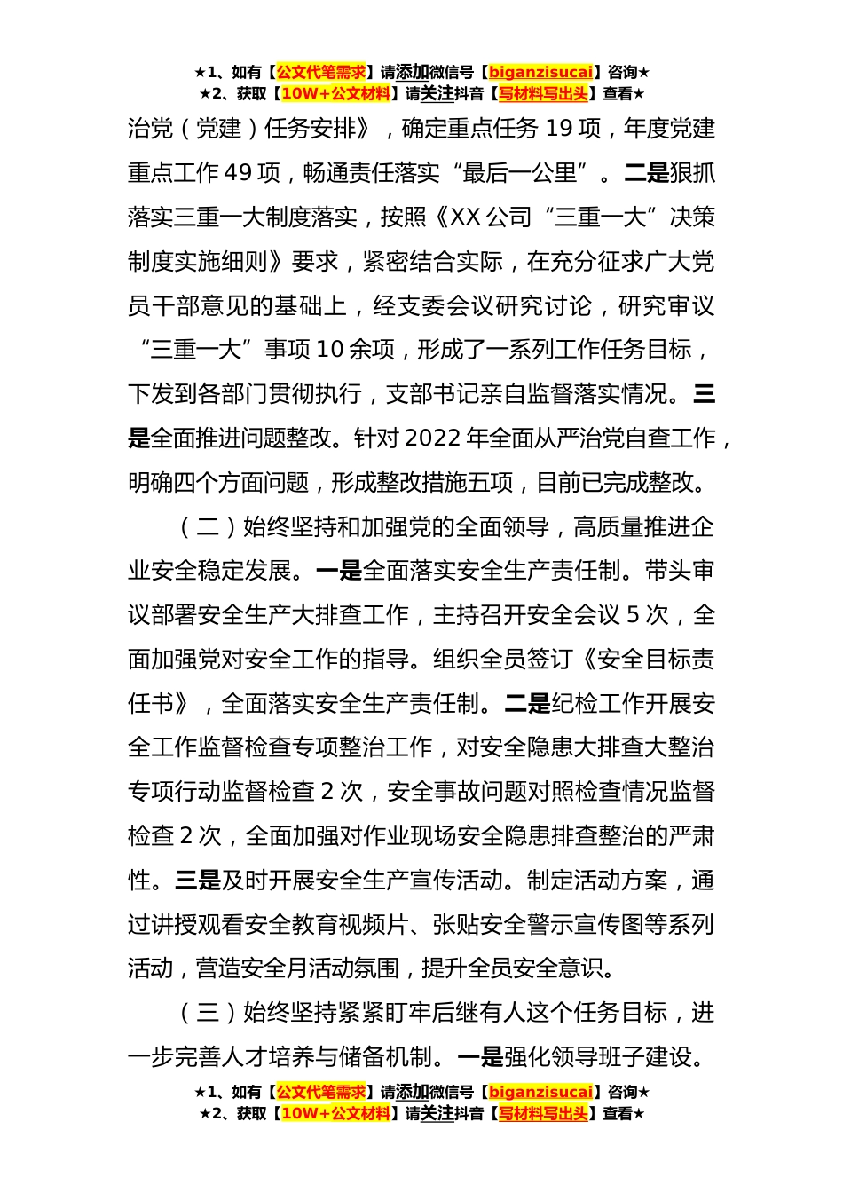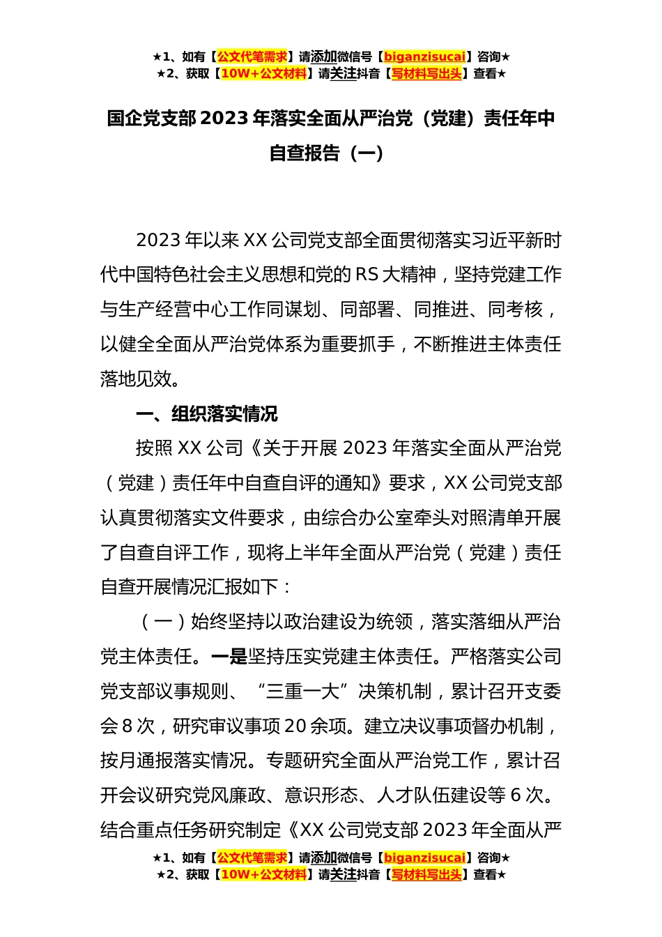 ★1、如有【公文代笔需求】请添加微信号【biganzisucai】咨询★★2、获取【10W+公文材料】请关注抖音【写材料写出头】查看★国企党支部2023年落实全面从严治党(党建)责任年中自查报告(一)2023年以来XX公司党支部全面贯彻落实习近平新时代中国特色社会主义思想和党的RS大精神,坚持党建工作与生产经营中心工作同谋划、同部署、同推进、同考核,以健全全面从严治党体系为重要抓手,不断推进主体责任落地见效。一、组织落实情况按照XX公司《关于开展2023年落实全面从严治党(党建)责任年中自查自评的通知》要求,XX公司党支部认真贯彻落实文件要求,由综合办公室牵头对照清单开展了自查自评工作,现将上半年全面从严治党(党建)责任自查开展情况汇报如下:(一)始终坚持以政治建设为统领,落实落细从严治党主...