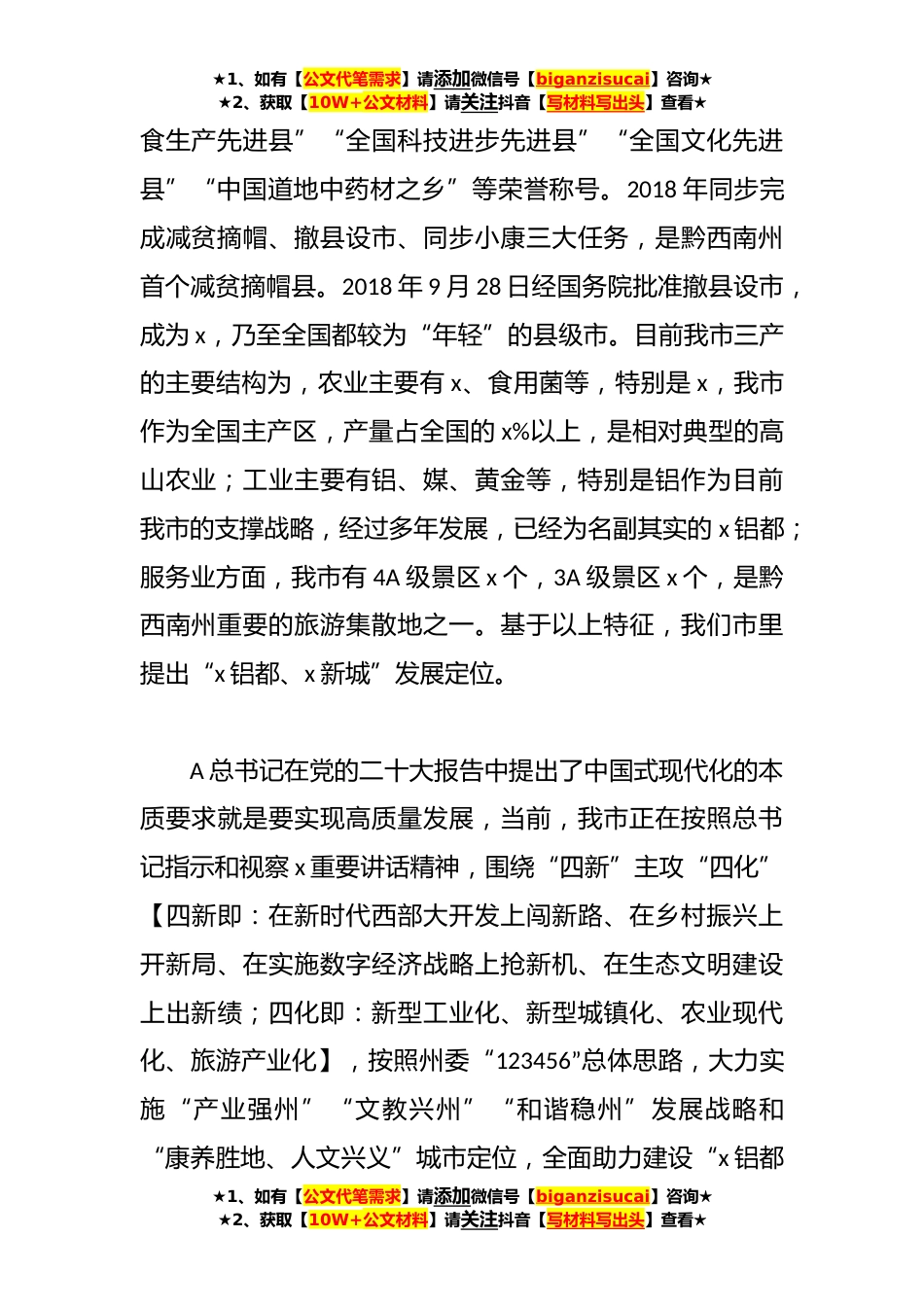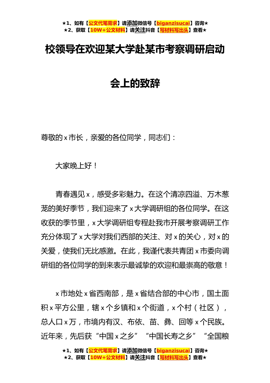 ★1、如有【公文代笔需求】请添加微信号【biganzisucai】咨询★★2、获取【10W+公文材料】请关注抖音【写材料写出头】查看★校领导在欢迎某大学赴某市考察调研启动会上的致辞尊敬的x市长,亲爱的各位同学,同志们:大家晚上好!青春遇见x,感受多彩魅力。在这个清凉四溢、万木葱茏的美好季节,我们迎来了x大学调研组的各位同学。在这收获的季节里,x大学调研组专程赴我市开展考察调研工作充分体现了x大学对我们西部的关注、对x的关心,对x的关爱,使我们无比感激。在此,我谨代表共青团x市委向调研组的各位同学的到来表示最诚挚的欢迎和最崇高的敬意!x市地处x省西南部,是x省结合部的中心市,国土面积x平方公里,辖x个乡镇和x个街道,x个村(社区),总人口x万,市境内有汉、布依、苗、彝、回等x个民族。近年来,...