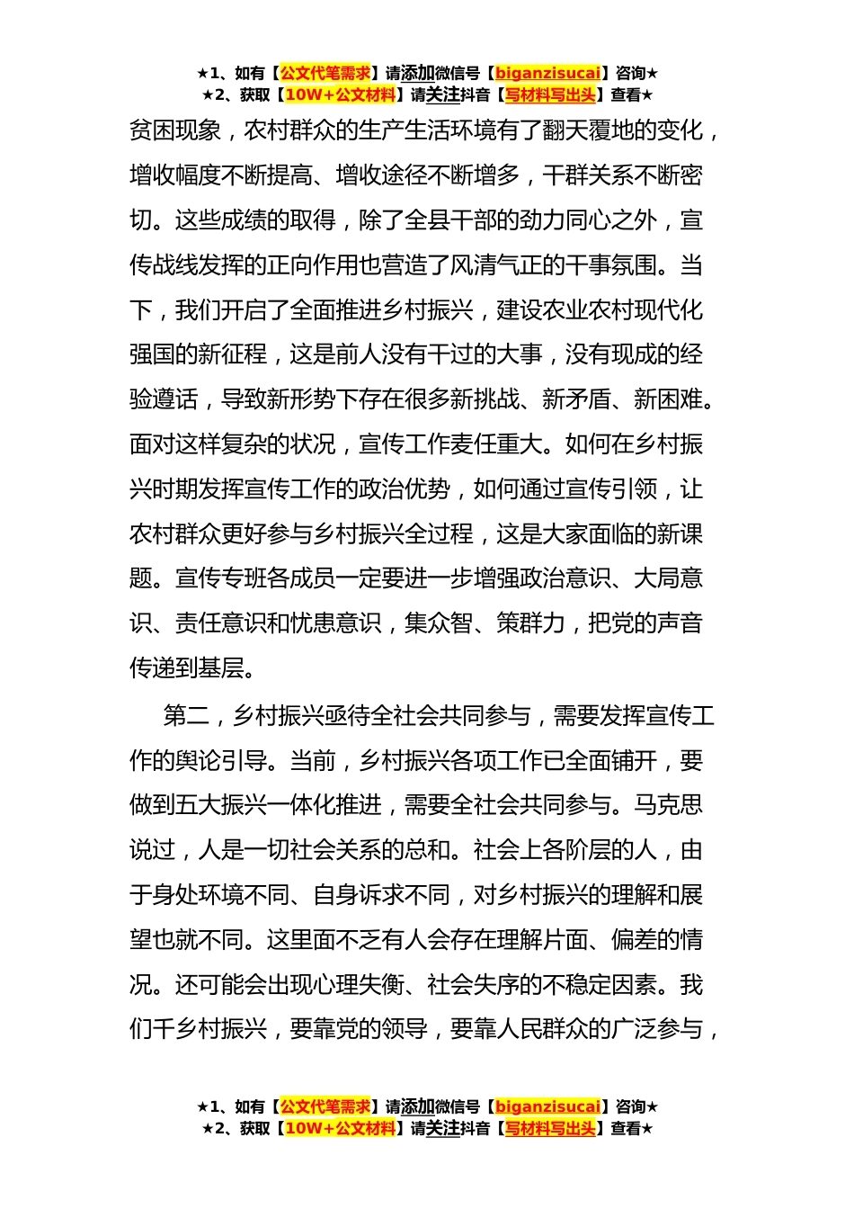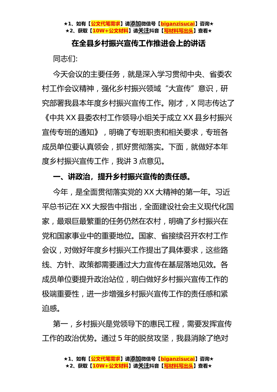 ★1、如有【公文代笔需求】请添加微信号【biganzisucai】咨询★★2、获取【10W+公文材料】请关注抖音【写材料写出头】查看★在全县乡村振兴宣传工作推进会上的讲话同志们:今天会议的主要任务,就是深入学习贯彻中央、省委农村工作会议精神,强化乡村振兴领域“大宣传”意识,研究部署我县本年度乡村振兴宣传工作。刚才,X同志传达了《中共XX县委农村工作领导小组关于成立XX县乡村振兴宣传专班的通知》,明确了专班职责和相关要求,专班各成员单位要认真领会,抓好贯彻落实。下面,就做好本年度乡村振兴宣传工作,我讲3点意见。一、讲政治,提升乡村振兴宣传的责任感。今年,是全面贯彻落实党的XX大精神的第一年。习近平总书记在XX大报告中指出,全面建设社会主义现代化国家,最艰巨最繁重的任务仍然在农村,明确了...