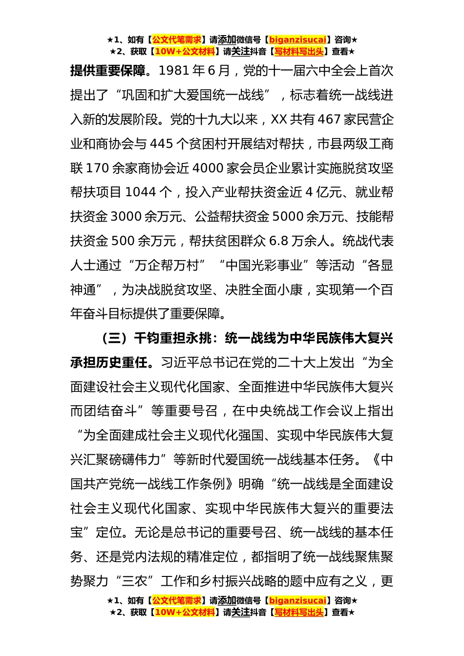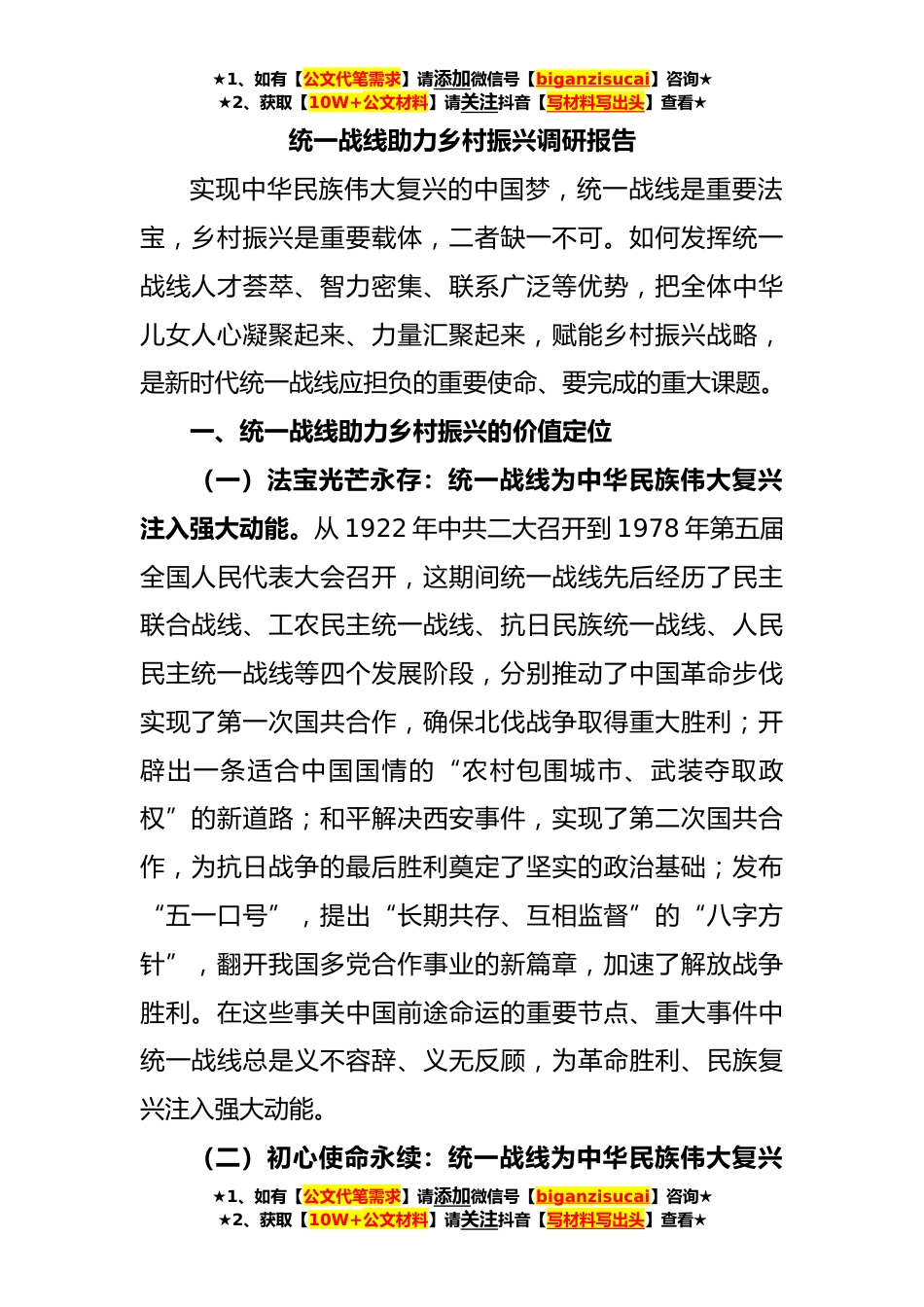 ★1、如有【公文代笔需求】请添加微信号【biganzisucai】咨询★★2、获取【10W+公文材料】请关注抖音【写材料写出头】查看★统一战线助力乡村振兴调研报告实现中华民族伟大复兴的中国梦,统一战线是重要法宝,乡村振兴是重要载体,二者缺一不可。如何发挥统一战线人才荟萃、智力密集、联系广泛等优势,把全体中华儿女人心凝聚起来、力量汇聚起来,赋能乡村振兴战略,是新时代统一战线应担负的重要使命、要完成的重大课题。一、统一战线助力乡村振兴的价值定位(一)法宝光芒永存:统一战线为中华民族伟大复兴注入强大动能。从1922年中共二大召开到1978年第五届全国人民代表大会召开,这期间统一战线先后经历了民主联合战线、工农民主统一战线、抗日民族统一战线、人民民主统一战线等四个发展阶段,分别推动了中国...