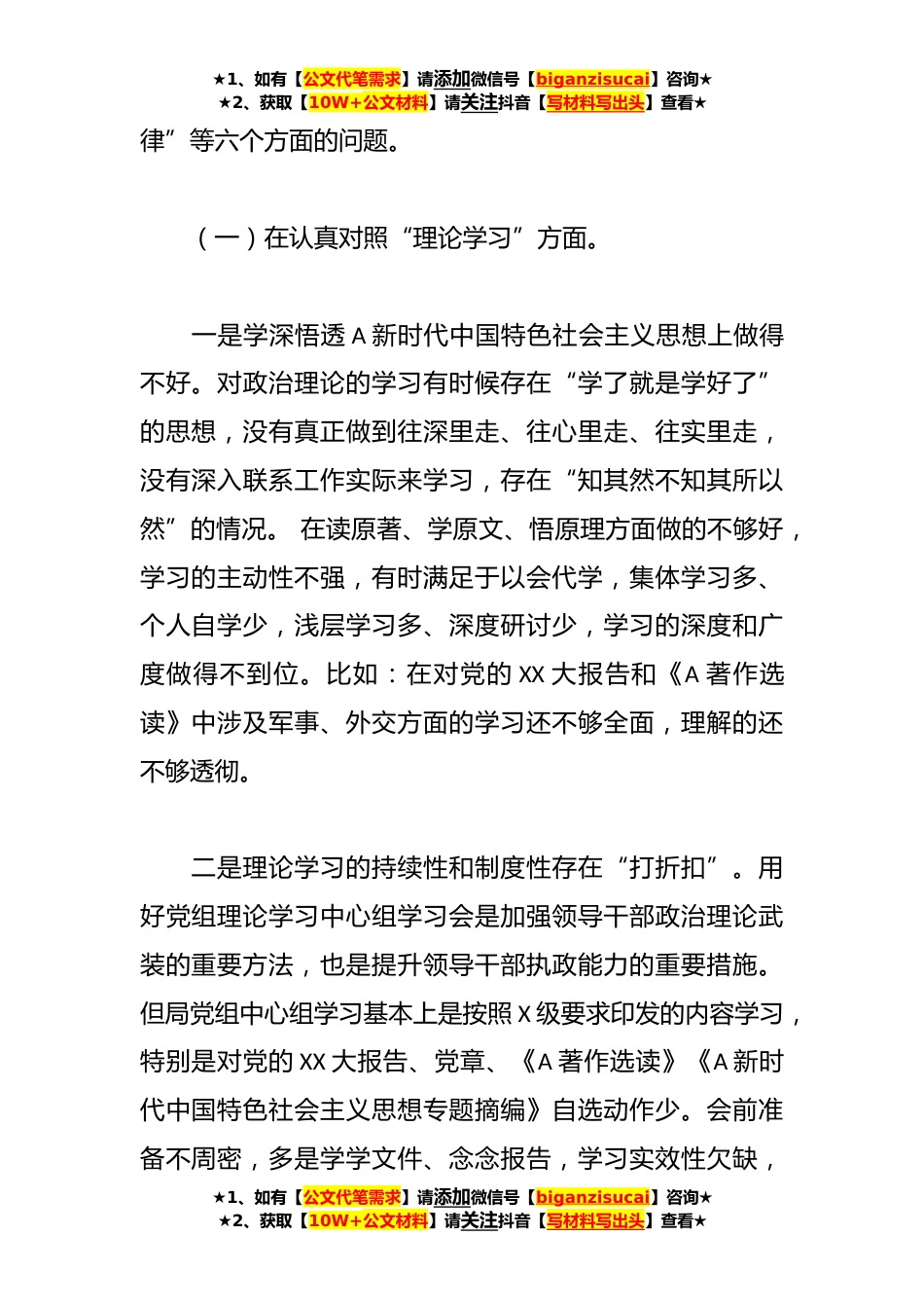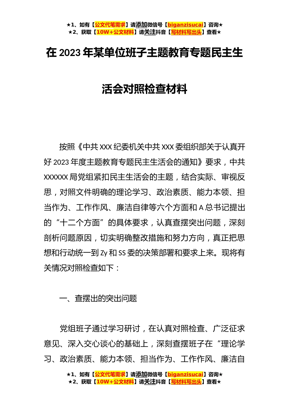 ★1、如有【公文代笔需求】请添加微信号【biganzisucai】咨询★★2、获取【10W+公文材料】请关注抖音【写材料写出头】查看★在2023年某单位班子主题教育专题民主生活会对照检查材料按照《中共XXX纪委机关中共XXX委组织部关于认真开好2023年度主题教育专题民主生活会的通知》要求,中共XXXXXX局党组紧扣民主生活会的主题,结合实际、审视反思,对照文件明确的理论学习、政治素质、能力本领、担当作为、工作作风、廉洁自律等六个方面和A总书记提出的“十二个方面”的具体要求,认真查摆突出问题,深刻剖析问题原因,切实明确整改措施和努力方向,真正把思想和行动统一到Zy和SS委的决策部署和要求上来。现将有关情况对照检查如下:一、查摆出的突出问题党组班子通过学习研讨,在认真对照检查、广泛征求意见、深入交心...