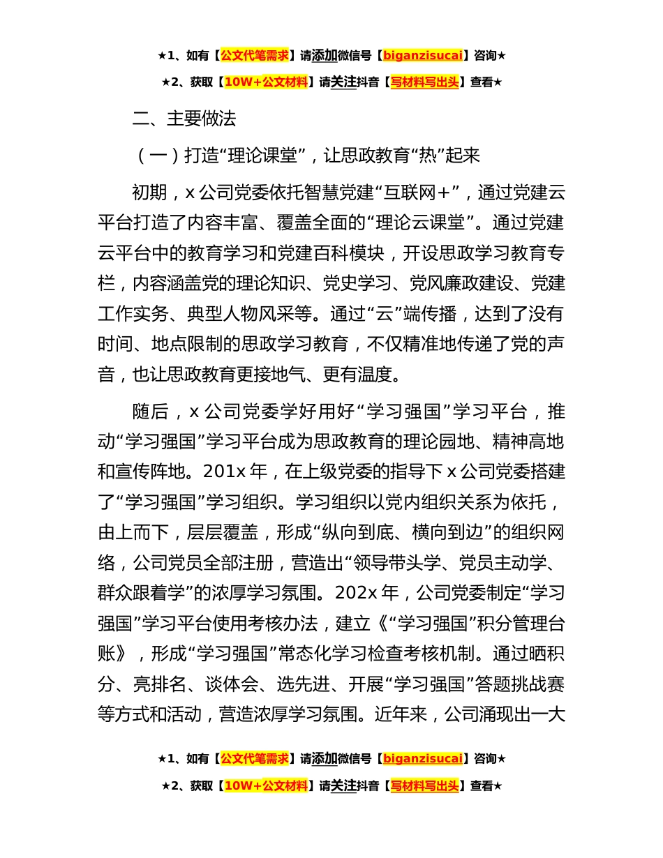 ★1、如有【公文代笔需求】请添加微信号【biganzisucai】咨询★★2、获取【10W+公文材料】请关注抖音【写材料写出头】查看★某国企公司思想政治工作案例《关于新时代加强和改进思想政治工作的意见》指出,思想政治工作是党的优良传统、鲜明特色和突出政治优势,是一切工作的生命线。xx公司把思想政治工作作为一项经常性、基础性工作来抓,结合发展目标和工作实际,不断改进思想政治工作理念、方式和方法,营造良好的思想政治工作氛围,切实提高思想政治工作的实效性,推动公司运营管理工作高质量发展。一、基本情况xx公司内设机关xx个部室,基层站队xx个。现有员工xxx人。xx公司党委成立于x年x月,现有党支部xx个,党员xxx名。xx公司党委始终坚持以习近平新时代中国特色社会主义思想为指导,积极找准党建工作和业...