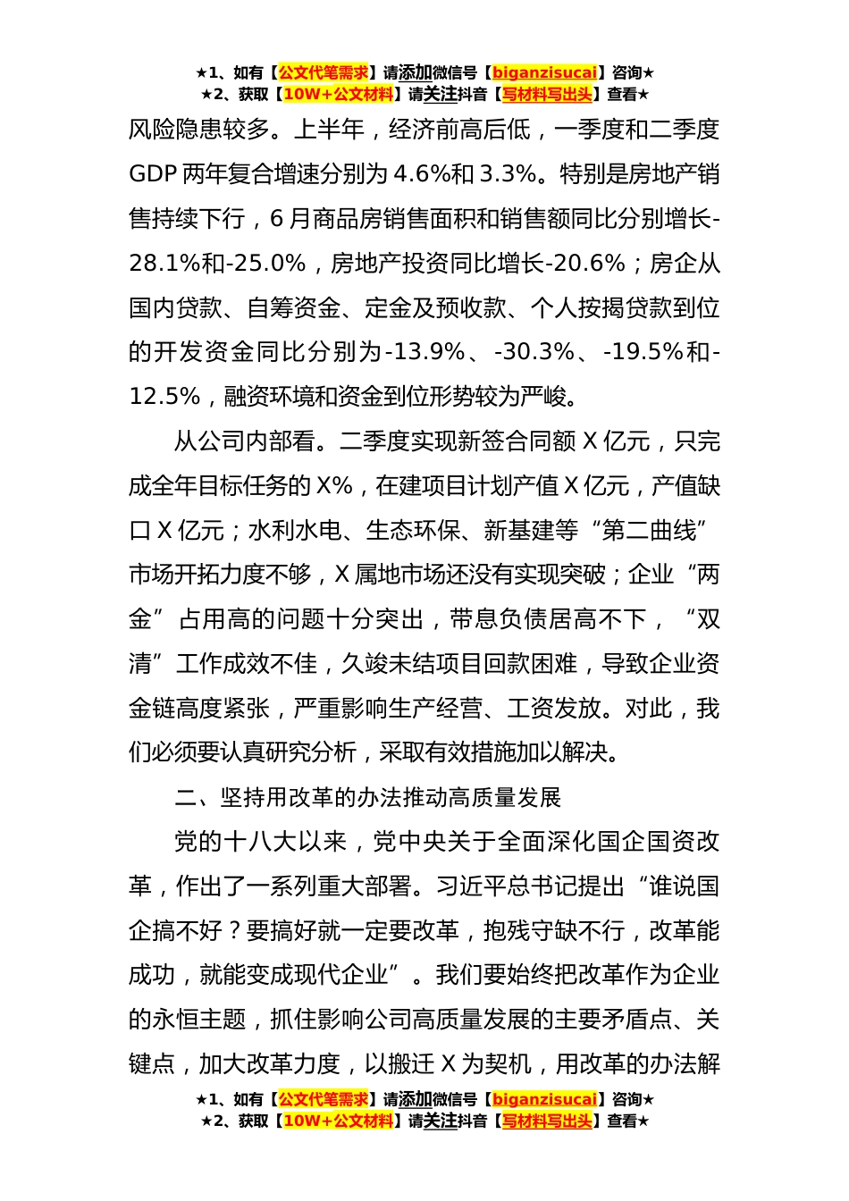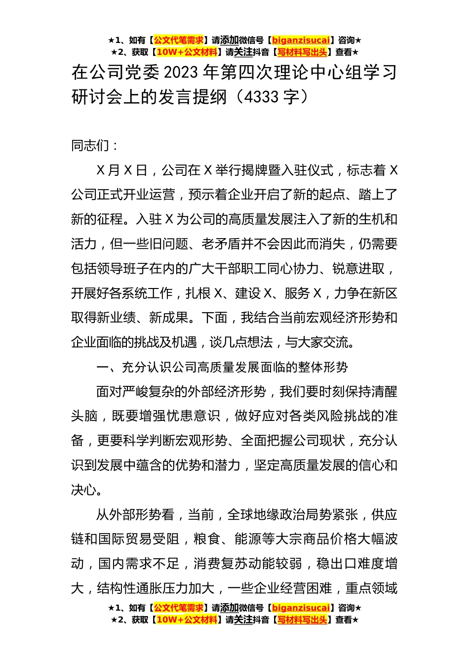 ★1、如有【公文代笔需求】请添加微信号【biganzisucai】咨询★★2、获取【10W+公文材料】请关注抖音【写材料写出头】查看★在公司党委2023年第四次理论中心组学习研讨会上的发言提纲(4333字)同志们:X月X日,公司在X举行揭牌暨入驻仪式,标志着X公司正式开业运营,预示着企业开启了新的起点、踏上了新的征程。入驻X为公司的高质量发展注入了新的生机和活力,但一些旧问题、老矛盾并不会因此而消失,仍需要包括领导班子在内的广大干部职工同心协力、锐意进取,开展好各系统工作,扎根X、建设X、服务X,力争在新区取得新业绩、新成果。下面,我结合当前宏观经济形势和企业面临的挑战及机遇,谈几点想法,与大家交流。一、充分认识公司高质量发展面临的整体形势面对严峻复杂的外部经济形势,我们要时刻保持清醒头...