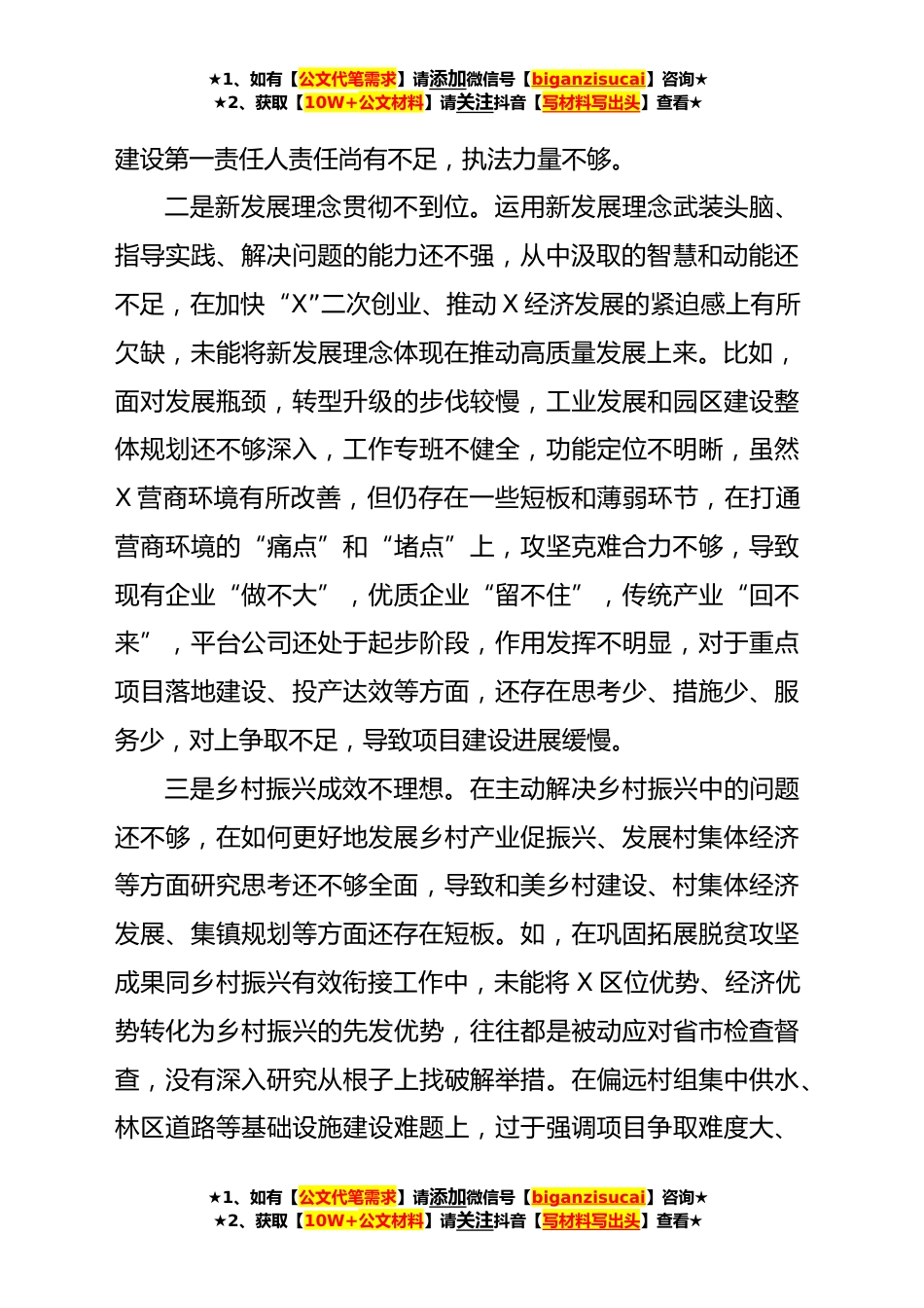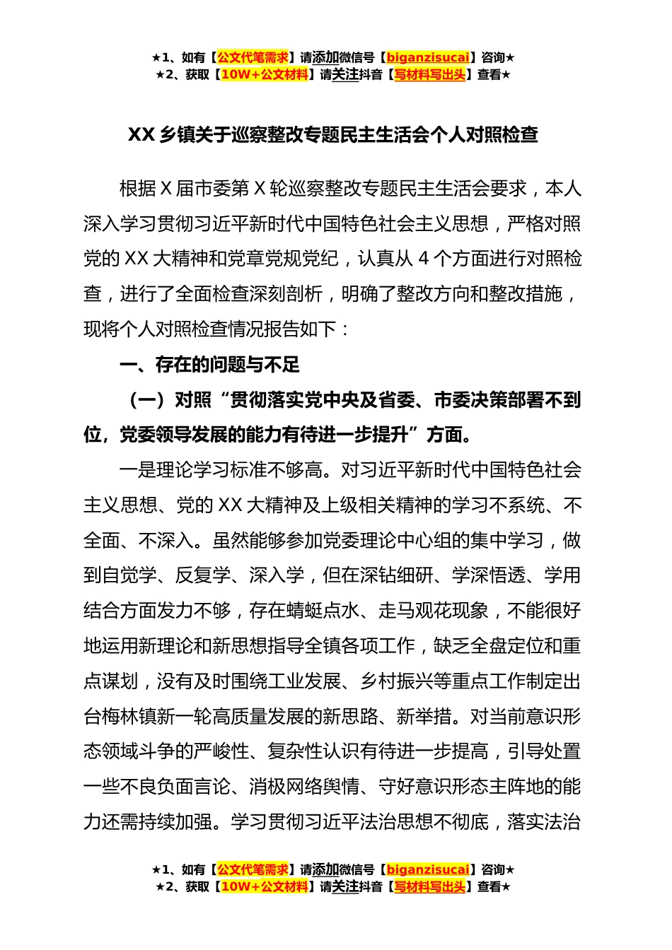 ★1、如有【公文代笔需求】请添加微信号【biganzisucai】咨询★★2、获取【10W+公文材料】请关注抖音【写材料写出头】查看★XX乡镇关于巡察整改专题民主生活会个人对照检查根据X届市委第X轮巡察整改专题民主生活会要求,本人深入学习贯彻习近平新时代中国特色社会主义思想,严格对照党的XX大精神和党章党规党纪,认真从4个方面进行对照检查,进行了全面检查深刻剖析,明确了整改方向和整改措施,现将个人对照检查情况报告如下:一、存在的问题与不足(一)对照“贯彻落实党中央及省委、市委决策部署不到位,党委领导发展的能力有待进一步提升”方面。一是理论学习标准不够高。对习近平新时代中国特色社会主义思想、党的XX大精神及上级相关精神的学习不系统、不全面、不深入。虽然能够参加党委理论中心组的集中学习...