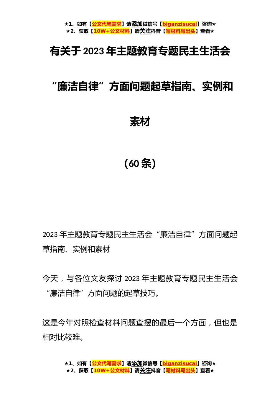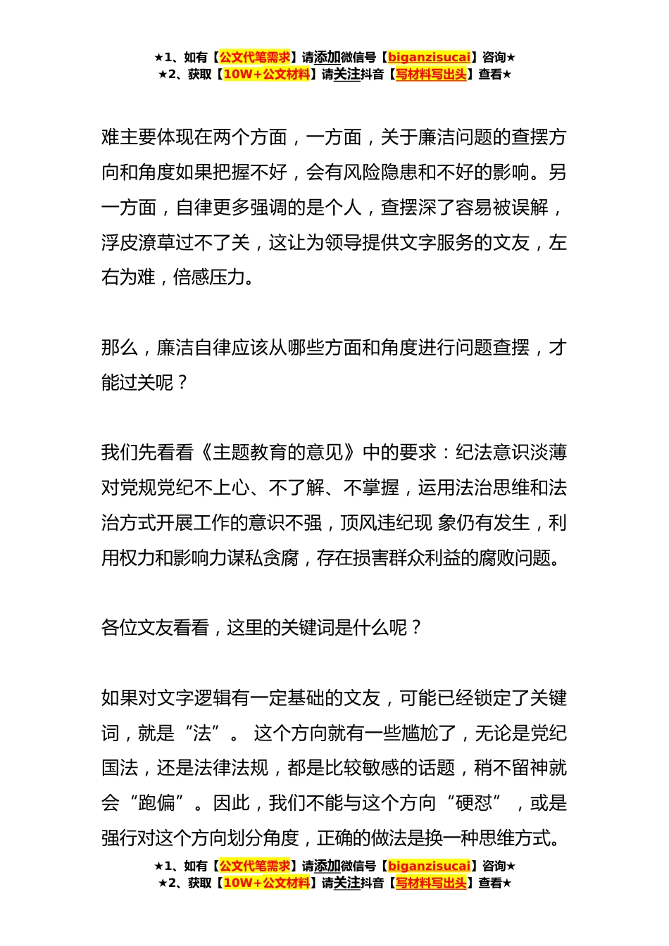 ★1、如有【公文代笔需求】请添加微信号【biganzisucai】咨询★★2、获取【10W+公文材料】请关注抖音【写材料写出头】查看★有关于2023年主题教育专题民主生活会“廉洁自律”方面问题起草指南、实例和素材(60条)2023年主题教育专题民主生活会“廉洁自律”方面问题起草指南、实例和素材今天,与各位文友探讨2023年主题教育专题民主生活会“廉洁自律”方面问题的起草技巧。这是今年对照检查材料问题查摆的最后一个方面,但也是相对比较难。★1、如有【公文代笔需求】请添加微信号【biganzisucai】咨询★★2、获取【10W+公文材料】请关注抖音【写材料写出头】查看★★1、如有【公文代笔需求】请添加微信号【biganzisucai】咨询★★2、获取【10W+公文材料】请关注抖音【写材料写出头】查看★难主要体现在两个方面,...