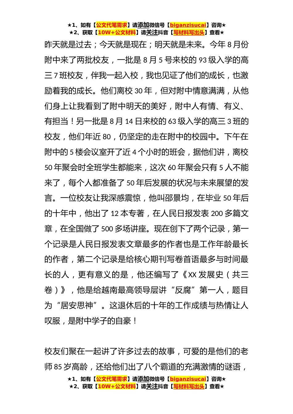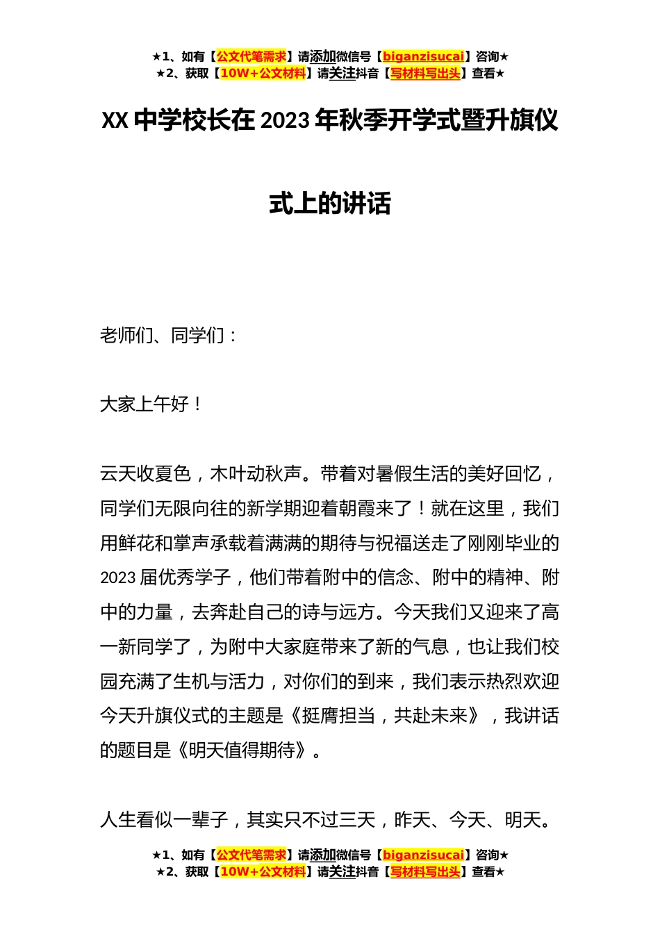 ★1、如有【公文代笔需求】请添加微信号【biganzisucai】咨询★★2、获取【10W+公文材料】请关注抖音【写材料写出头】查看★XX中学校长在2023年秋季开学式暨升旗仪式上的讲话老师们、同学们:大家上午好!云天收夏色,木叶动秋声。带着对暑假生活的美好回忆,同学们无限向往的新学期迎着朝霞来了!就在这里,我们用鲜花和掌声承载着满满的期待与祝福送走了刚刚毕业的2023届优秀学子,他们带着附中的信念、附中的精神、附中的力量,去奔赴自己的诗与远方。今天我们又迎来了高一新同学了,为附中大家庭带来了新的气息,也让我们校园充满了生机与活力,对你们的到来,我们表示热烈欢迎今天升旗仪式的主题是《挺膺担当,共赴未来》,我讲话的题目是《明天值得期待》。人生看似一辈子,其实只不过三天,昨天、今天、明...