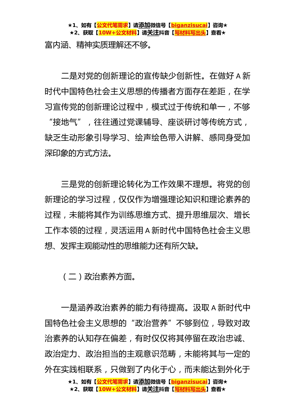 ★1、如有【公文代笔需求】请添加微信号【biganzisucai】咨询★★2、获取【10W+公文材料】请关注抖音【写材料写出头】查看★2023年主题教育专题民主生活会个人(六个方面)剖析材料根据主题教育专题民主生活会工作方案的要求,我紧紧围绕会议主题,按照“学思想、强党性、重实践、建新功”的目标要求,本人坚持学做结合、查改结合,全面对照六个方面,特别是对照A总书记关于以学铸魂、以学增智、以学正风、以学促干的12条具体要求,开展自查反思查问题、找成因、定措施。现对照检查情况汇报如下:一、存在问题(一)理论学习方面一是在“学懂”上有差距。我虽然能够积极通过中心组学习、个人自学等方式加强对党的创新理论学习,但是学习还不够全面、深入,学习只浮在表面,学习方法单一精力不够集中,常常以工作忙...