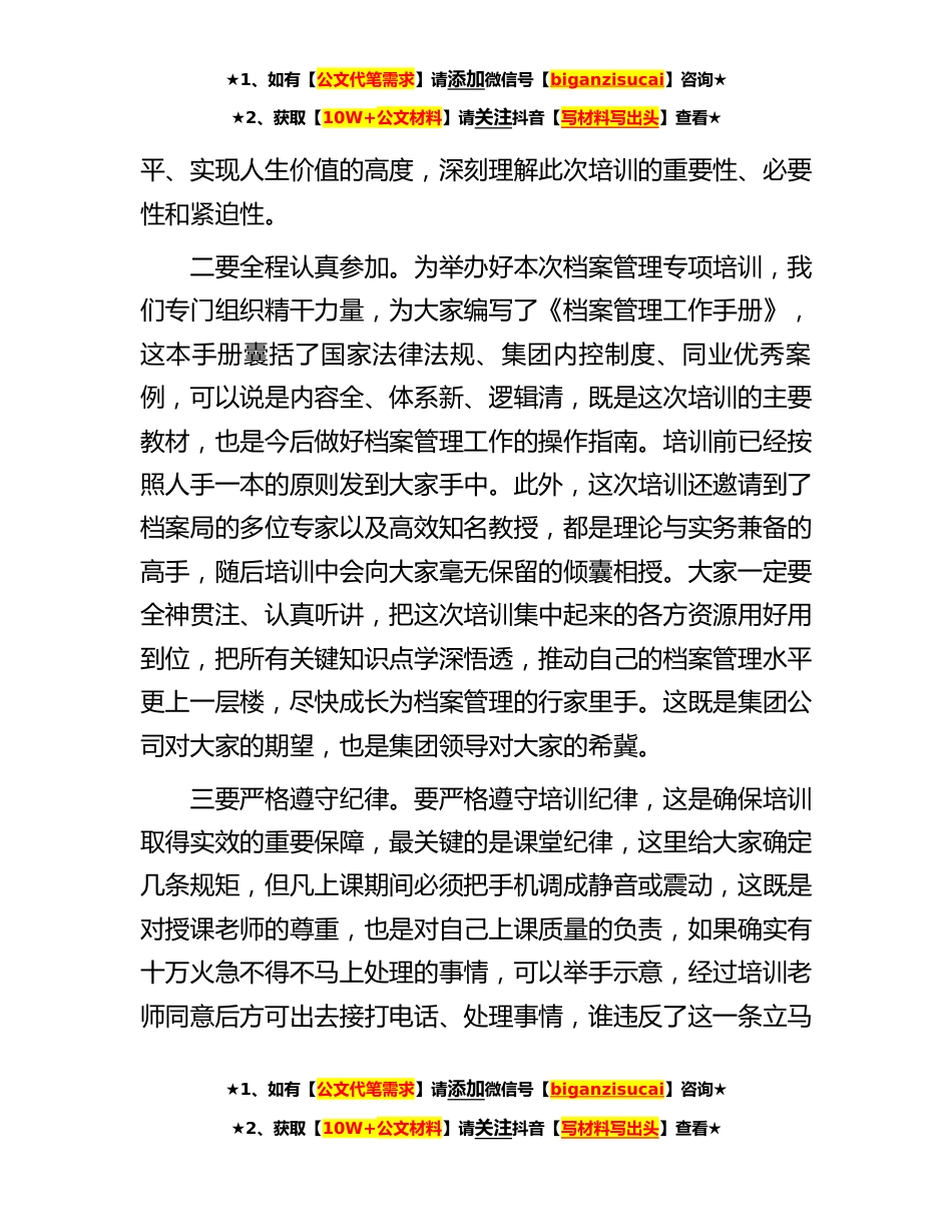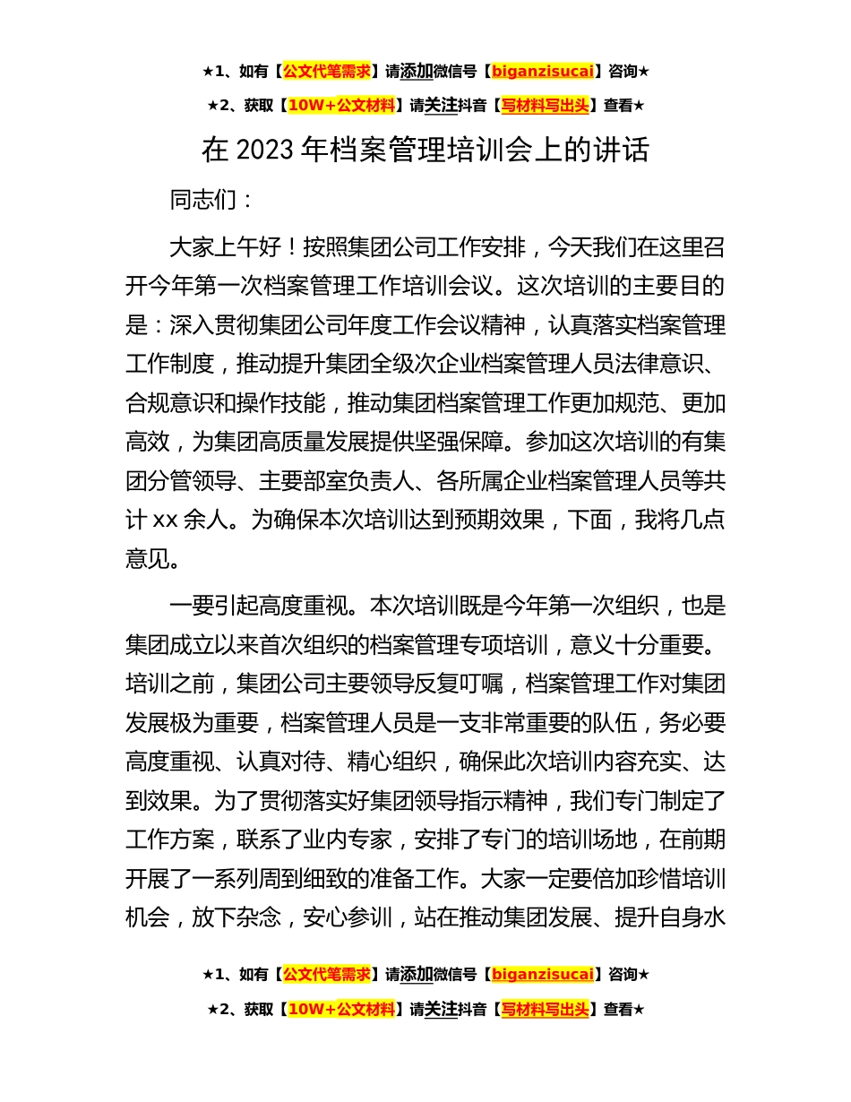 ★1、如有【公文代笔需求】请添加微信号【biganzisucai】咨询★★2、获取【10W+公文材料】请关注抖音【写材料写出头】查看★在2023年档案管理培训会上的讲话同志们:大家上午好!按照集团公司工作安排,今天我们在这里召开今年第一次档案管理工作培训会议。这次培训的主要目的是:深入贯彻集团公司年度工作会议精神,认真落实档案管理工作制度,推动提升集团全级次企业档案管理人员法律意识、合规意识和操作技能,推动集团档案管理工作更加规范、更加高效,为集团高质量发展提供坚强保障。参加这次培训的有集团分管领导、主要部室负责人、各所属企业档案管理人员等共计xx余人。为确保本次培训达到预期效果,下面,我将几点意见。一要引起高度重视。本次培训既是今年第一次组织,也是集团成立以来首次组织的档案管...