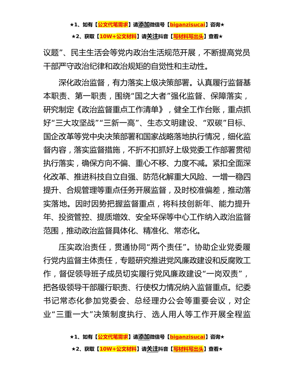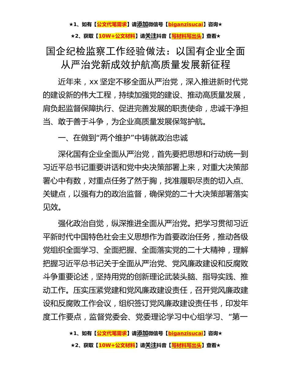 ★1、如有【公文代笔需求】请添加微信号【biganzisucai】咨询★★2、获取【10W+公文材料】请关注抖音【写材料写出头】查看★国企纪检监察工作经验做法:以国有企业全面从严治党新成效护航高质量发展新征程近年来,xx坚定不移全面从严治党,深入推进新时代党的建设新的伟大工程,持续加强党的建设、推动高质量发展,肩负起监督保障执行、促进完善发展的职责使命,忠诚干净担当、敢于善于斗争,为企业高质量发展保驾护航。“”一、在做到两个维护中铸就政治忠诚深化国有企业全面从严治党,首先要把思想和行动统一到习近平总书记重要讲话和党中央决策部署上来,对重大决策部署心中有数,对重点任务了然于胸,找准履职尽责的切入点、关键点,以强有力的政治监督,确保党的二十大决策部署落实见效。强化政治自觉,纵深...