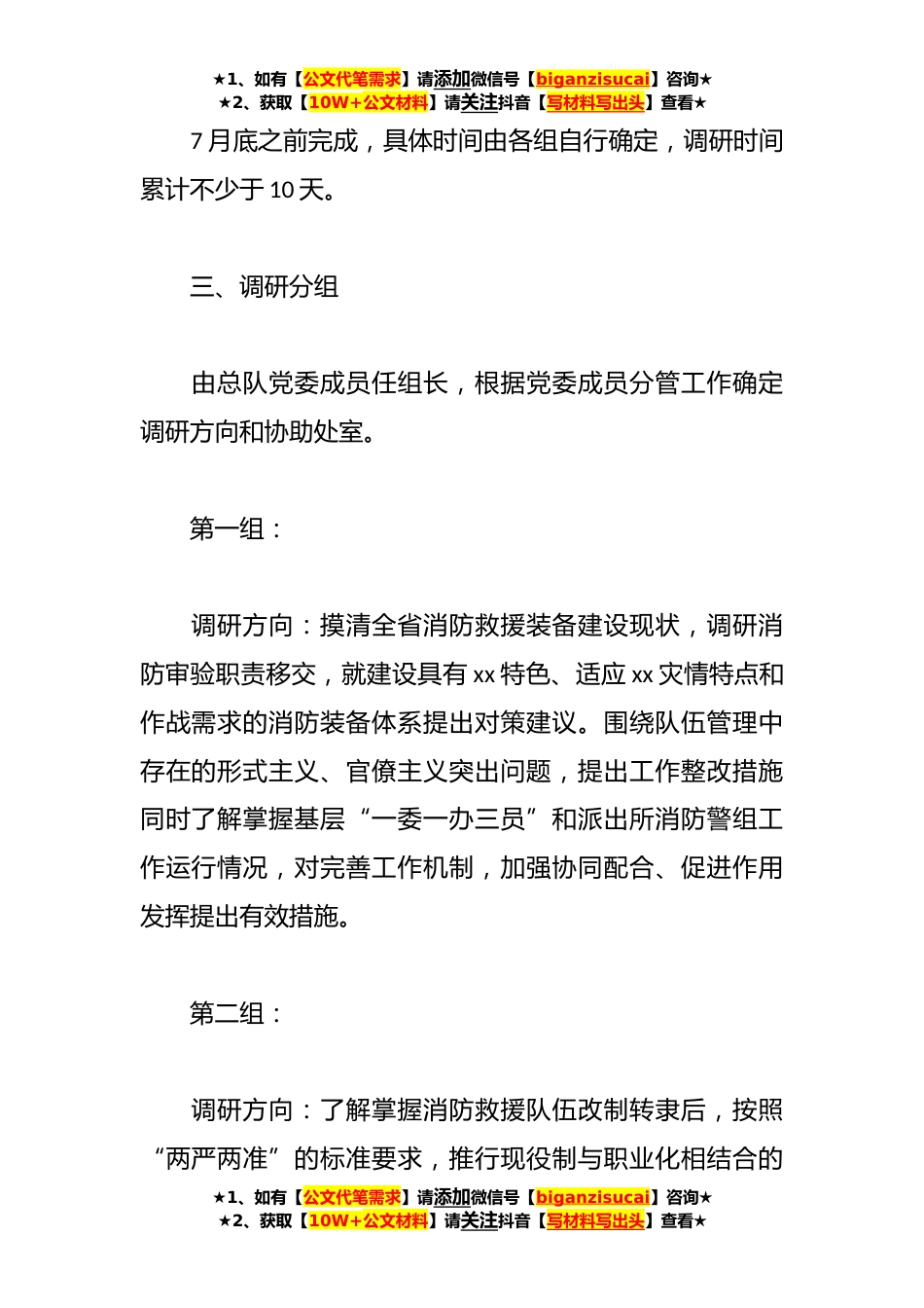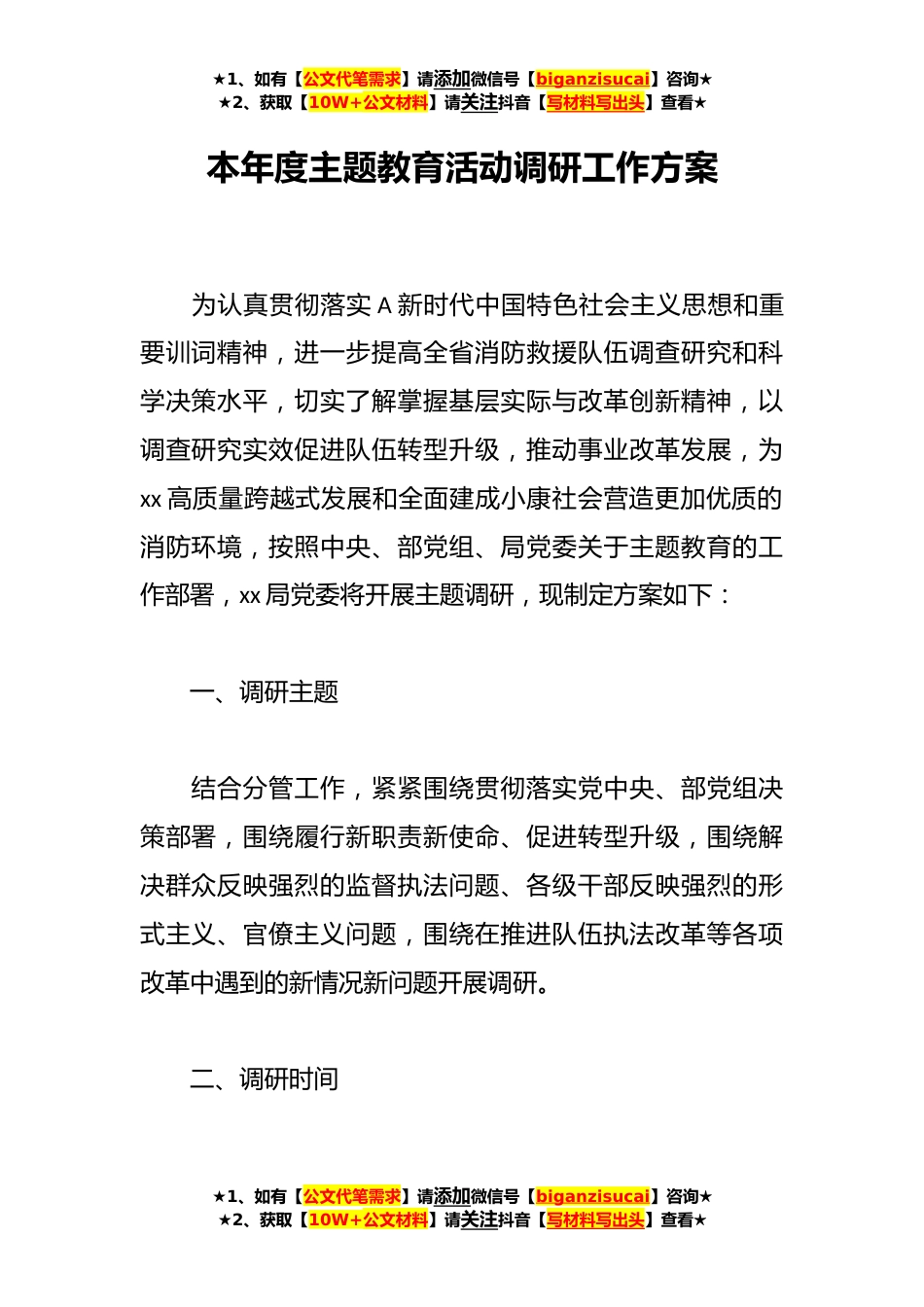 ★1、如有【公文代笔需求】请添加微信号【biganzisucai】咨询★★2、获取【10W+公文材料】请关注抖音【写材料写出头】查看★本年度主题教育活动调研工作方案为认真贯彻落实A新时代中国特色社会主义思想和重要训词精神,进一步提高全省消防救援队伍调查研究和科学决策水平,切实了解掌握基层实际与改革创新精神,以调查研究实效促进队伍转型升级,推动事业改革发展,为xx高质量跨越式发展和全面建成小康社会营造更加优质的消防环境,按照中央、部党组、局党委关于主题教育的工作部署,xx局党委将开展主题调研,现制定方案如下:一、调研主题结合分管工作,紧紧围绕贯彻落实党中央、部党组决策部署,围绕履行新职责新使命、促进转型升级,围绕解决群众反映强烈的监督执法问题、各级干部反映强烈的形式主义、官僚主义...