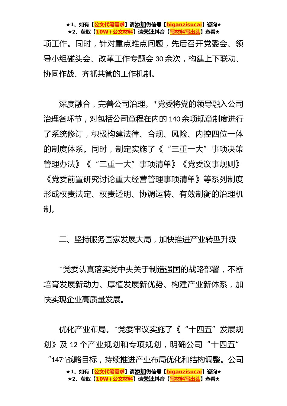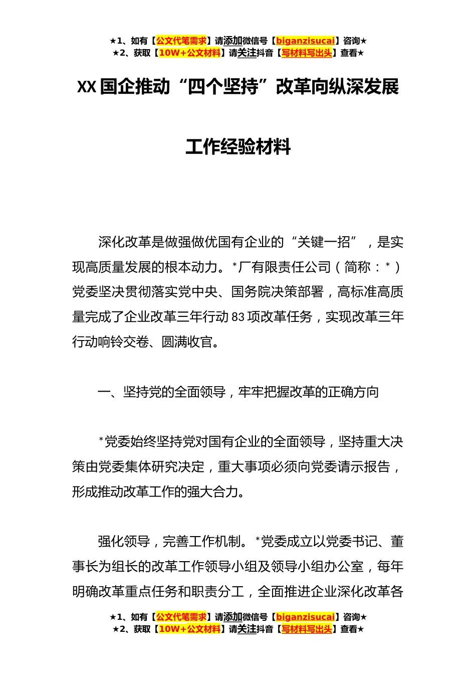 ★1、如有【公文代笔需求】请添加微信号【biganzisucai】咨询★★2、获取【10W+公文材料】请关注抖音【写材料写出头】查看★XX国企推动“四个坚持”改革向纵深发展工作经验材料深化改革是做强做优国有企业的“关键一招”,是实现高质量发展的根本动力。*厂有限责任公司(简称:*)党委坚决贯彻落实党中央、国务院决策部署,高标准高质量完成了企业改革三年行动83项改革任务,实现改革三年行动响铃交卷、圆满收官。一、坚持党的全面领导,牢牢把握改革的正确方向*党委始终坚持党对国有企业的全面领导,坚持重大决策由党委集体研究决定,重大事项必须向党委请示报告,形成推动改革工作的强大合力。强化领导,完善工作机制。*党委成立以党委书记、董事长为组长的改革工作领导小组及领导小组办公室,每年明确改革重点...
