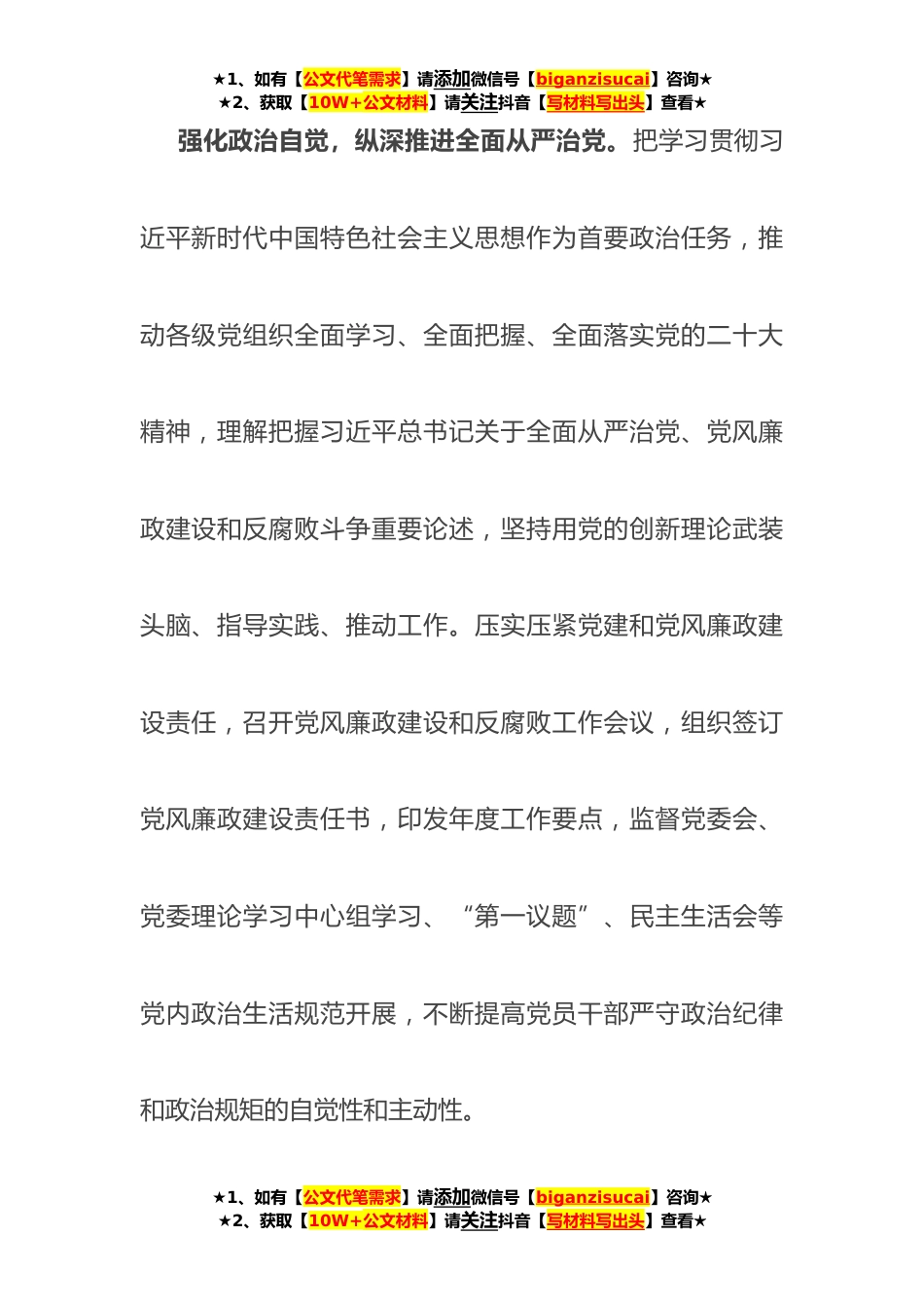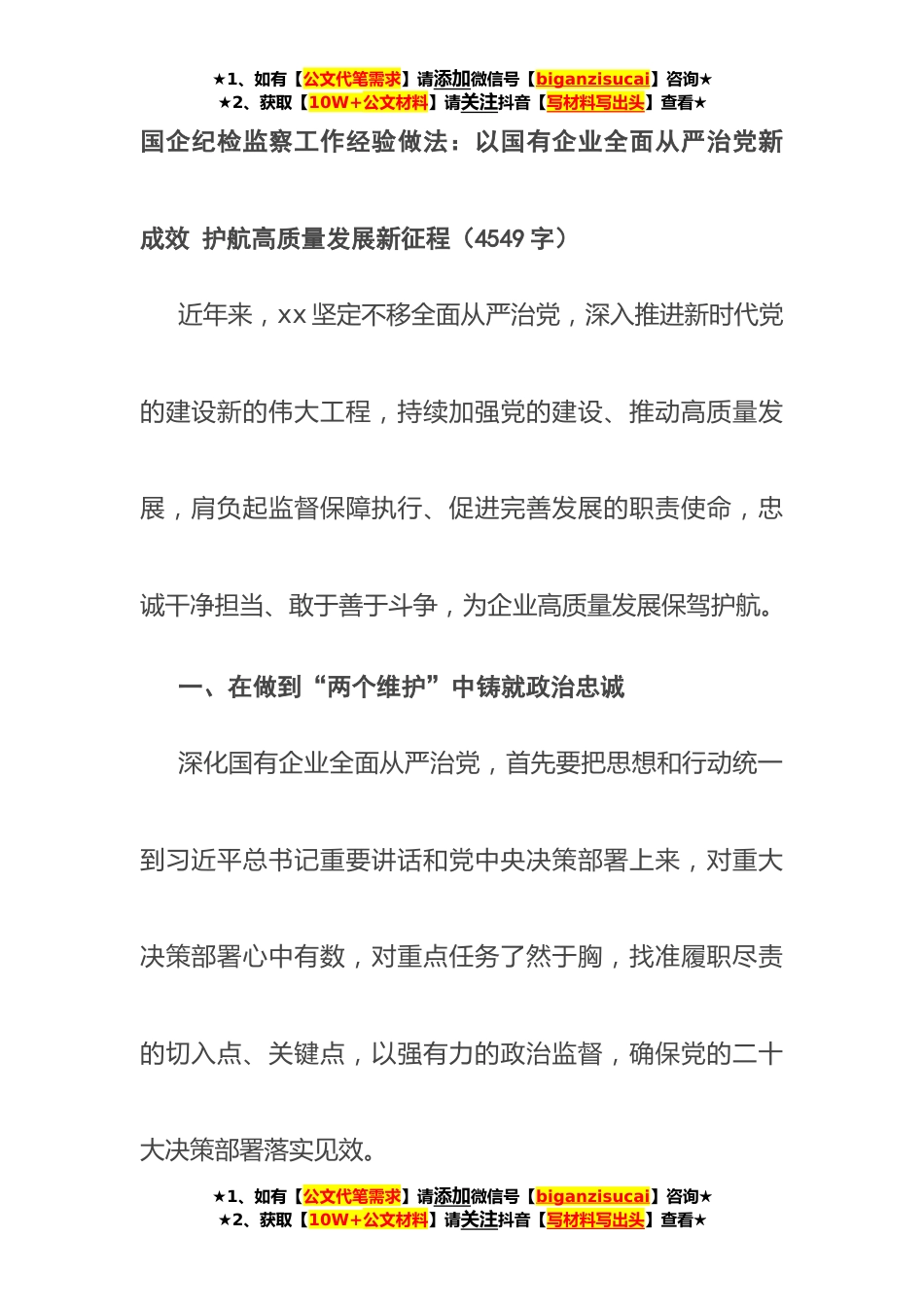 ★1、如有【公文代笔需求】请添加微信号【biganzisucai】咨询★★2、获取【10W+公文材料】请关注抖音【写材料写出头】查看★国企纪检监察工作经验做法:以国有企业全面从严治党新成效护航高质量发展新征程(4549字)近年来,xx坚定不移全面从严治党,深入推进新时代党的建设新的伟大工程,持续加强党的建设、推动高质量发展,肩负起监督保障执行、促进完善发展的职责使命,忠诚干净担当、敢于善于斗争,为企业高质量发展保驾护航。一、在做到“两个维护”中铸就政治忠诚深化国有企业全面从严治党,首先要把思想和行动统一到习近平总书记重要讲话和党中央决策部署上来,对重大决策部署心中有数,对重点任务了然于胸,找准履职尽责的切入点、关键点,以强有力的政治监督,确保党的二十大决策部署落实见效。★1、如有...