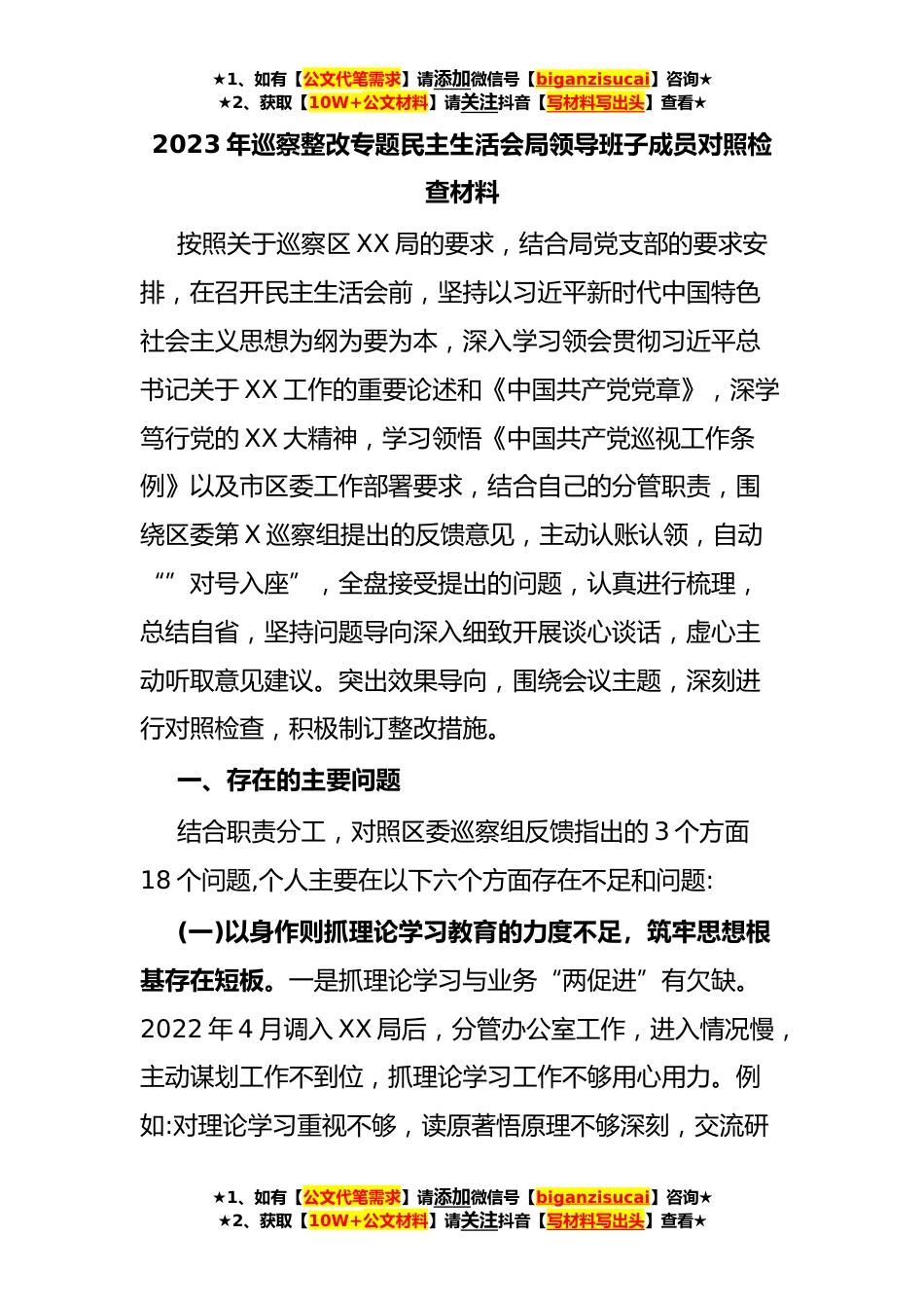 ★1、如有【公文代笔需求】请添加微信号【biganzisucai】咨询★★2、获取【10W+公文材料】请关注抖音【写材料写出头】查看★2023年巡察整改专题民主生活会局领导班子成员对照检查材料按照关于巡察区XX局的要求,结合局党支部的要求安排,在召开民主生活会前,坚持以习近平新时代中国特色社会主义思想为纲为要为本,深入学习领会贯彻习近平总书记关于XX工作的重要论述和《中国共产党党章》,深学笃行党的XX大精神,学习领悟《中国共产党巡视工作条例》以及市区委工作部署要求,结合自己的分管职责,围绕区委第X巡察组提出的反馈意见,主动认账认领,自动“”对号入座”,全盘接受提出的问题,认真进行梳理,总结自省,坚持问题导向深入细致开展谈心谈话,虚心主动听取意见建议。突出效果导向,围绕会议主题,深刻进...