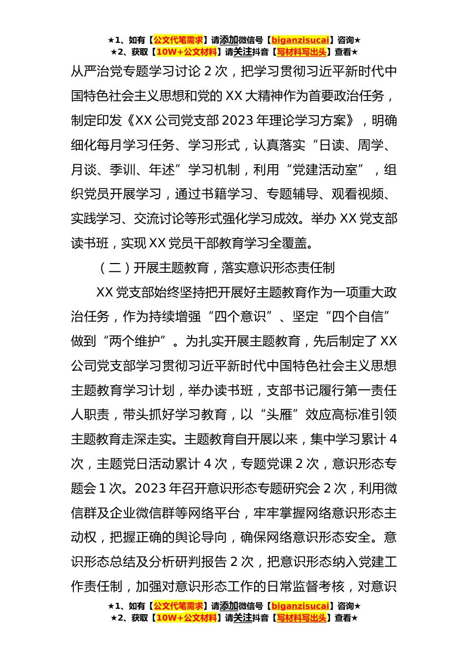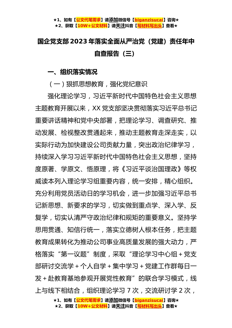 ★1、如有【公文代笔需求】请添加微信号【biganzisucai】咨询★★2、获取【10W+公文材料】请关注抖音【写材料写出头】查看★国企党支部2023年落实全面从严治党(党建)责任年中自查报告(三)一、组织落实情况(一)狠抓思想教育,强化党纪意识强化理论学习,习近平新时代中国特色社会主义思想主题教育开展以来,XX党支部坚决贯彻落实习近平总书记重要讲话精神和党中央部署,把理论学习、调查研究、推动发展、检视整改贯通起来,推动主题教育走深走实,以实际行动为加快建设公司贡献力量,突出政治纪律学习,持续深入学习习近平新时代中国特色社会主义思想,坚持度原著、学原文、悟原理,将《习近平谈治国理政》等权威读本列入理论学习组重要内容,统一安排,精心组织。充分利用党员活动日的学习机会,进一步加强...