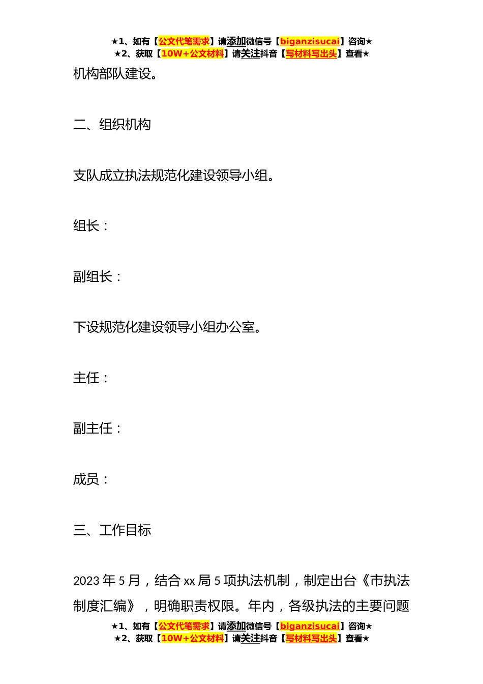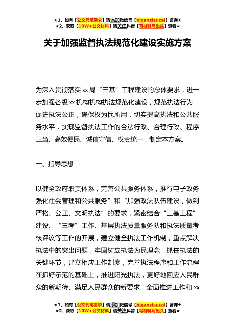 ★1、如有【公文代笔需求】请添加微信号【biganzisucai】咨询★★2、获取【10W+公文材料】请关注抖音【写材料写出头】查看★关于加强监督执法规范化建设实施方案为深入贯彻落实xx局“三基”工程建设的总体要求,进一步加强各级xx机构机构执法规范化建设,规范执法行为,促进执法公正,确保权为民所用,切实提高执法和公共服务水平,实现监督执法工作的合法行政、合理行政、程序正当、高效便民、诚信守信、权责统一,制定本方案。一、指导思想以健全政府职责体系,完善公共服务体系,推行电子政务强化社会管理和公共服务”和“加强政法队伍建设,做到严格、公正、文明执法”的要求,紧密结合“三基工程”建设、“三考”工作、基层执法质量服务队和执法质量考核评议等工作的开展,建立健全执法工作机制,重点解决执...
