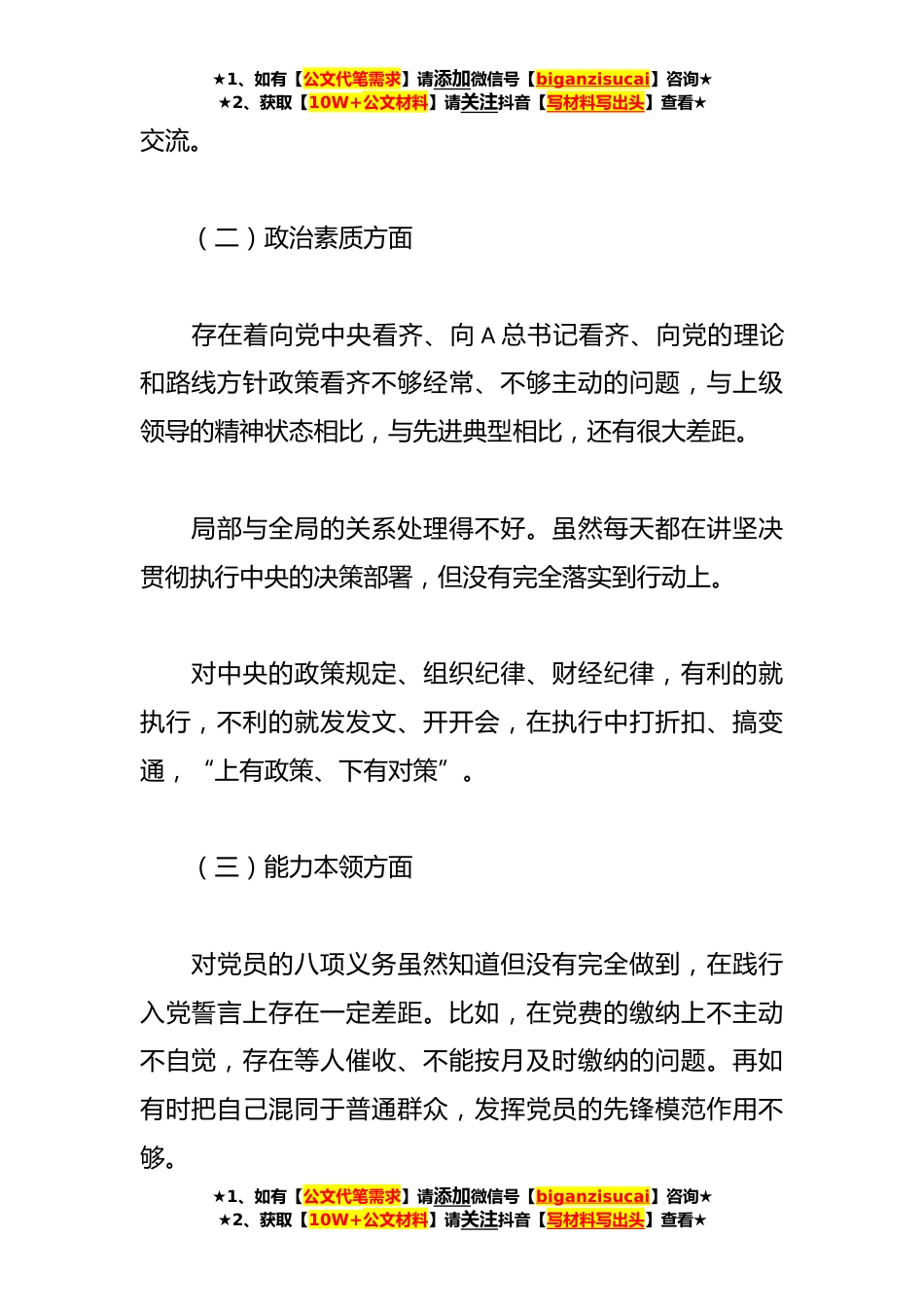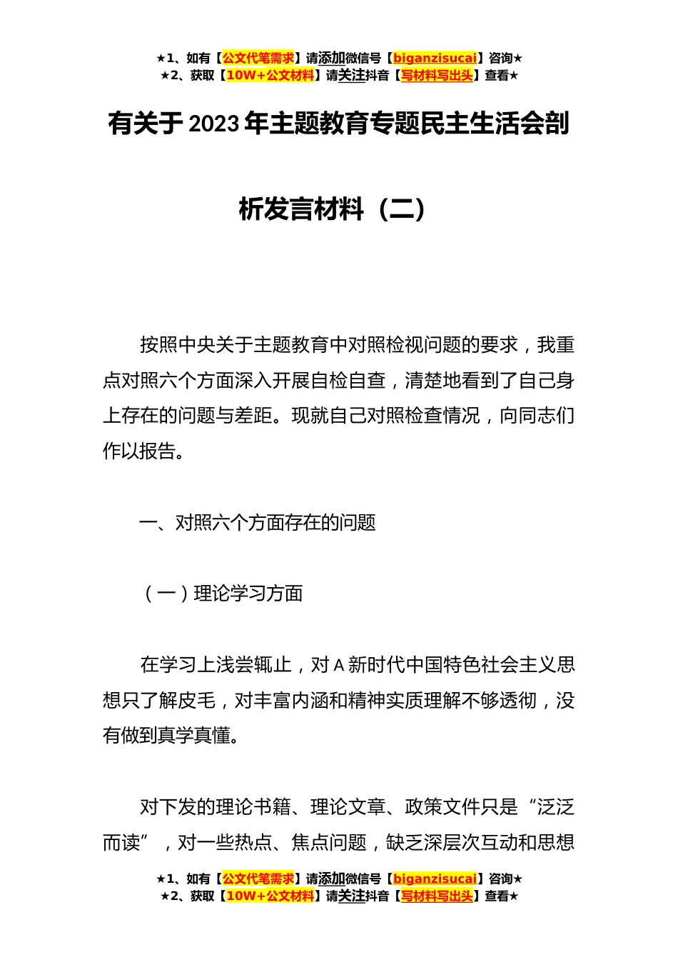★1、如有【公文代笔需求】请添加微信号【biganzisucai】咨询★★2、获取【10W+公文材料】请关注抖音【写材料写出头】查看★有关于2023年主题教育专题民主生活会剖析发言材料(二)按照中央关于主题教育中对照检视问题的要求,我重点对照六个方面深入开展自检自查,清楚地看到了自己身上存在的问题与差距。现就自己对照检查情况,向同志们作以报告。一、对照六个方面存在的问题(一)理论学习方面在学习上浅尝辄止,对A新时代中国特色社会主义思想只了解皮毛,对丰富内涵和精神实质理解不够透彻,没有做到真学真懂。对下发的理论书籍、理论文章、政策文件只是“泛泛而读”,对一些热点、焦点问题,缺乏深层次互动和思想★1、如有【公文代笔需求】请添加微信号【biganzisucai】咨询★★2、获取【10W+公文材料】请关...