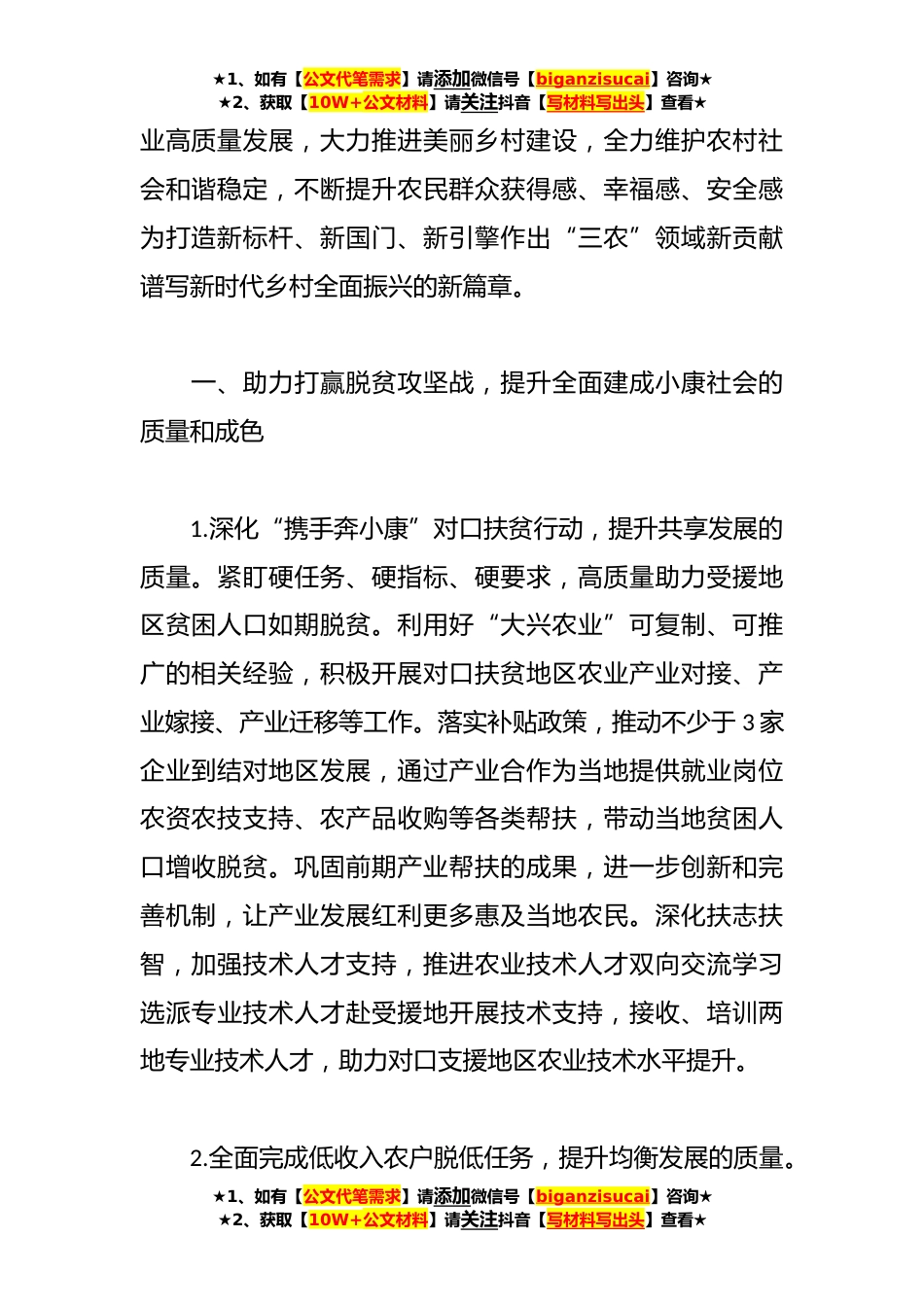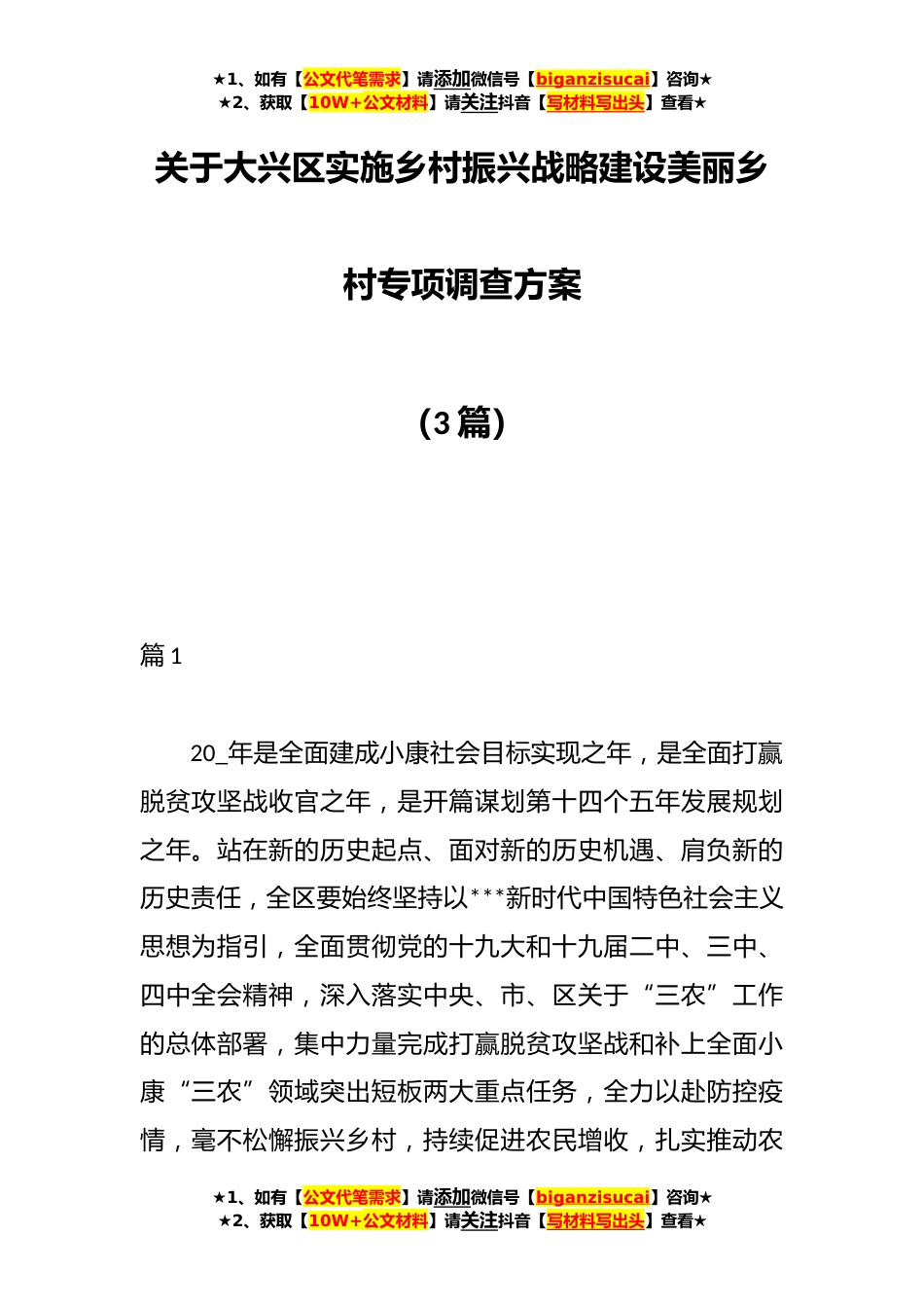 ★1、如有【公文代笔需求】请添加微信号【biganzisucai】咨询★★2、获取【10W+公文材料】请关注抖音【写材料写出头】查看★关于大兴区实施乡村振兴战略建设美丽乡村专项调查方案(3篇)篇120_年是全面建成小康社会目标实现之年,是全面打赢脱贫攻坚战收官之年,是开篇谋划第十四个五年发展规划之年。站在新的历史起点、面对新的历史机遇、肩负新的历史责任,全区要始终坚持以***新时代中国特色社会主义思想为指引,全面贯彻党的十九大和十九届二中、三中、四中全会精神,深入落实中央、市、区关于“三农”工作的总体部署,集中力量完成打赢脱贫攻坚战和补上全面小康“三农”领域突出短板两大重点任务,全力以赴防控疫情,毫不松懈振兴乡村,持续促进农民增收,扎实推动农★1、如有【公文代笔需求】请添加微信号【...
