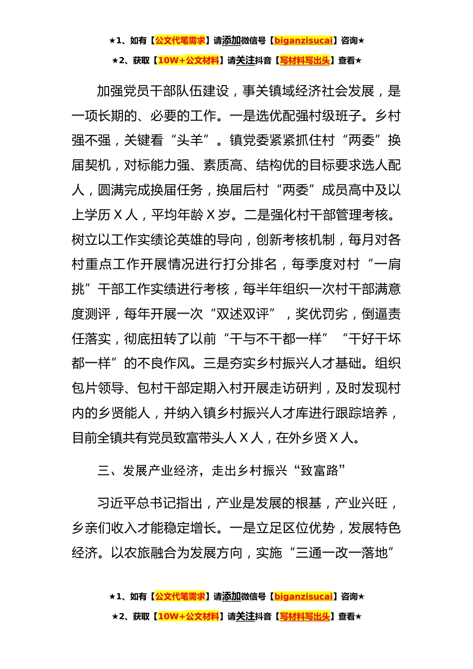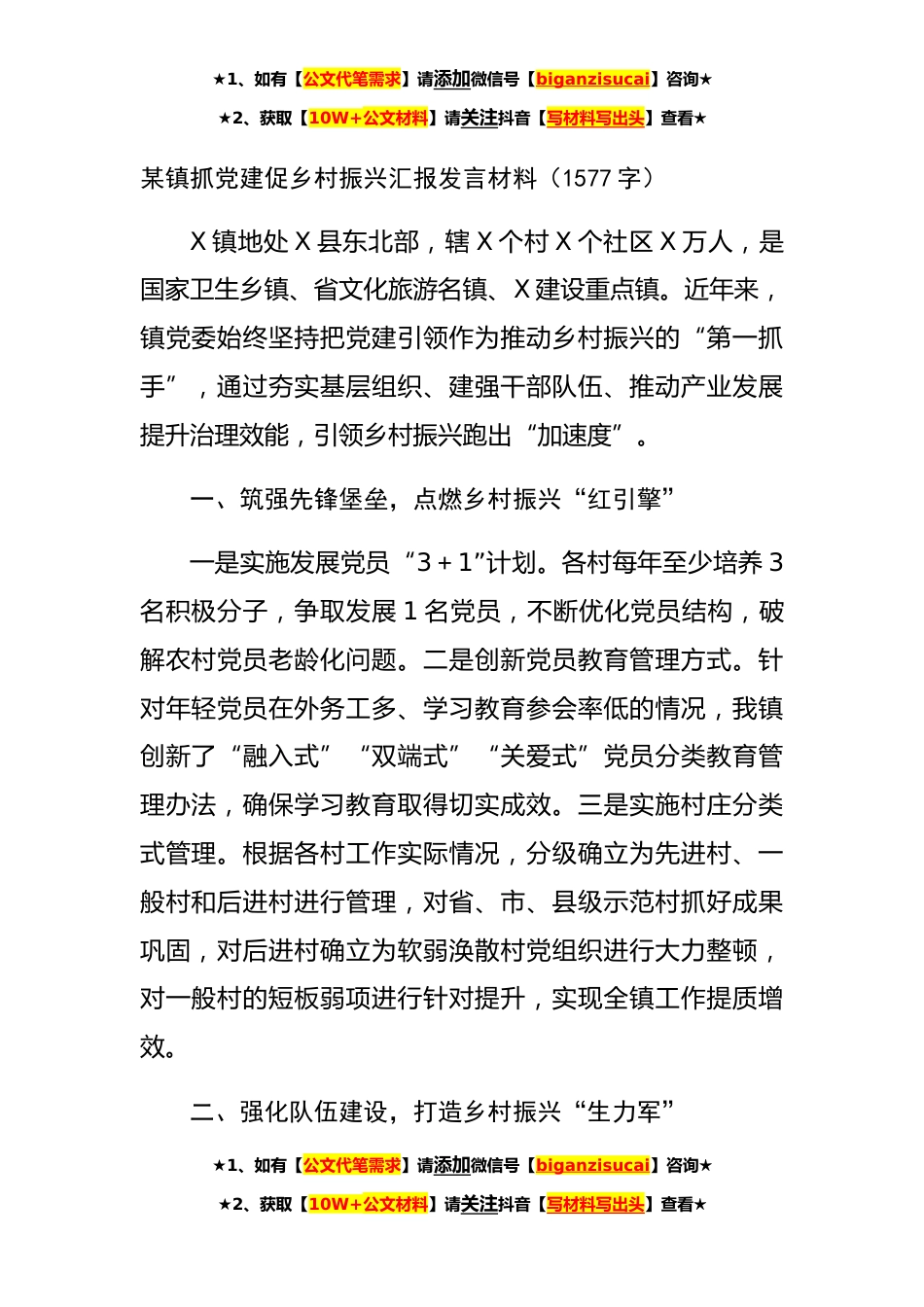 ★1、如有【公文代笔需求】请添加微信号【biganzisucai】咨询★★2、获取【10W+公文材料】请关注抖音【写材料写出头】查看★某镇抓党建促乡村振兴汇报发言材料(1577字)X镇地处X县东北部,辖X个村X个社区X万人,是国家卫生乡镇、省文化旅游名镇、X建设重点镇。近年来,镇党委始终坚持把党建引领作为推动乡村振兴的“第一抓手”,通过夯实基层组织、建强干部队伍、推动产业发展提升治理效能,引领乡村振兴跑出“加速度”。一、筑强先锋堡垒,点燃乡村振兴“红引擎”一是实施发展党员“3+1”计划。各村每年至少培养3名积极分子,争取发展1名党员,不断优化党员结构,破解农村党员老龄化问题。二是创新党员教育管理方式。针对年轻党员在外务工多、学习教育参会率低的情况,我镇创新了“融入式”“双端式”“关爱式...