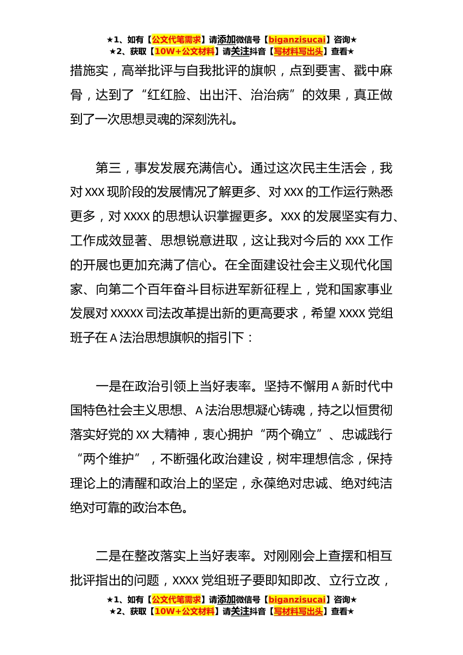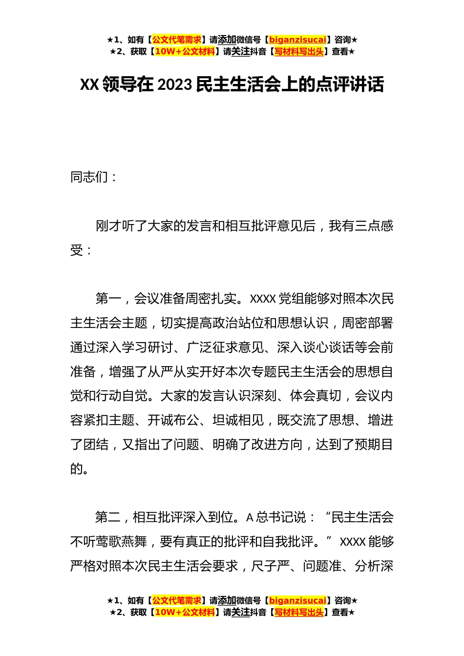 ★1、如有【公文代笔需求】请添加微信号【biganzisucai】咨询★★2、获取【10W+公文材料】请关注抖音【写材料写出头】查看★XX领导在2023民主生活会上的点评讲话同志们:刚才听了大家的发言和相互批评意见后,我有三点感受:第一,会议准备周密扎实。XXXX党组能够对照本次民主生活会主题,切实提高政治站位和思想认识,周密部署通过深入学习研讨、广泛征求意见、深入谈心谈话等会前准备,增强了从严从实开好本次专题民主生活会的思想自觉和行动自觉。大家的发言认识深刻、体会真切,会议内容紧扣主题、开诚布公、坦诚相见,既交流了思想、增进了团结,又指出了问题、明确了改进方向,达到了预期目的。第二,相互批评深入到位。A总书记说:“民主生活会不听莺歌燕舞,要有真正的批评和自我批评。”XXXX能够严格对照...