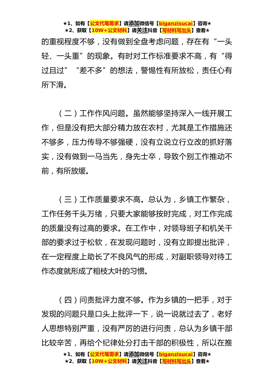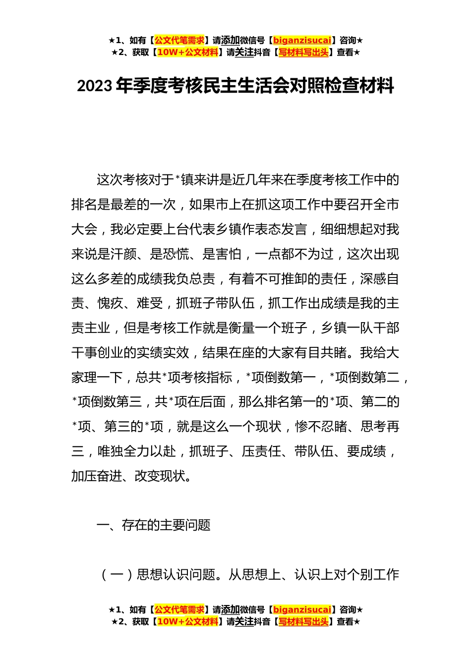 ★1、如有【公文代笔需求】请添加微信号【biganzisucai】咨询★★2、获取【10W+公文材料】请关注抖音【写材料写出头】查看★2023年季度考核民主生活会对照检查材料这次考核对于*镇来讲是近几年来在季度考核工作中的排名是最差的一次,如果市上在抓这项工作中要召开全市大会,我必定要上台代表乡镇作表态发言,细细想起对我来说是汗颜、是恐慌、是害怕,一点都不为过,这次出现这么多差的成绩我负总责,有着不可推卸的责任,深感自责、愧疚、难受,抓班子带队伍,抓工作出成绩是我的主责主业,但是考核工作就是衡量一个班子,乡镇一队干部干事创业的实绩实效,结果在座的大家有目共睹。我给大家理一下,总共*项考核指标,*项倒数第一,*项倒数第二,*项倒数第三,共*项在后面,那么排名第一的*项、第二的*项、第三...