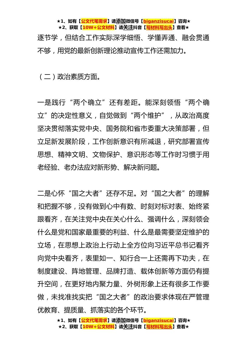 ★1、如有【公文代笔需求】请添加微信号【biganzisucai】咨询★★2、获取【10W+公文材料】请关注抖音【写材料写出头】查看★2023年主题教育民主生活会领导干部个人发言提纲一、检视问题(一)理论学习方面一是理论学习的“系统性”不够。有时还存在不能很好地处理“工”与“学”的问题,学习的全面性、系统性有待加强,存在“零敲碎打”“急学急用”的现象,对习近平新时代中国特色社会主义思想学习感悟还不够全面,对其中蕴含的思想内涵理解不够深入,用以谋划指导宣传思想文化工作不够到位。二是实践运用的“有效性”不够。围绕增强“四个意识”坚定“四个自信”、做到“两个维护”武装头脑、指导实践、推动工作还不到位,用党的XX大精神指导实践还需要进一步深化,满足于学原文、读原著,原原本本学、逐章★1、...