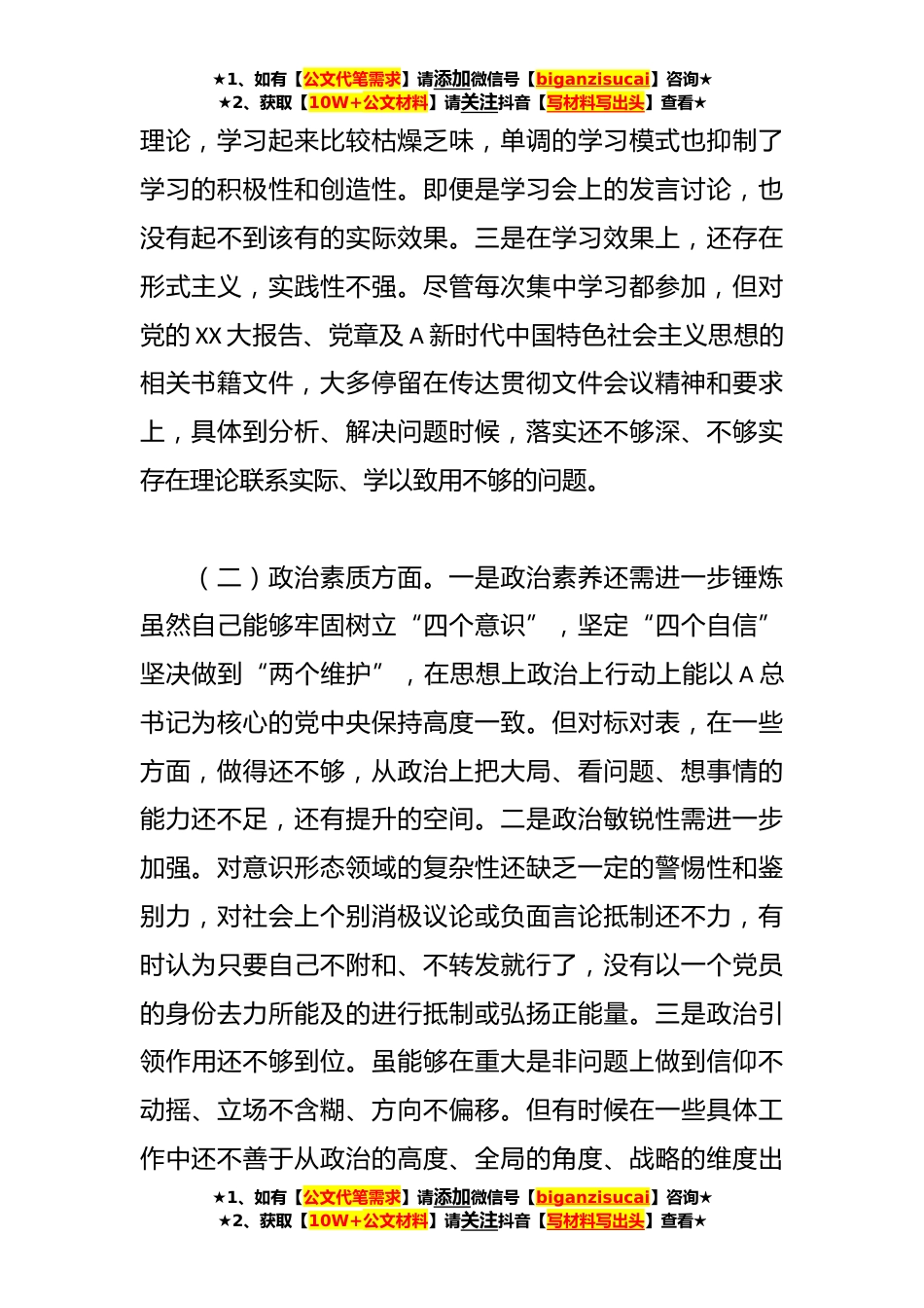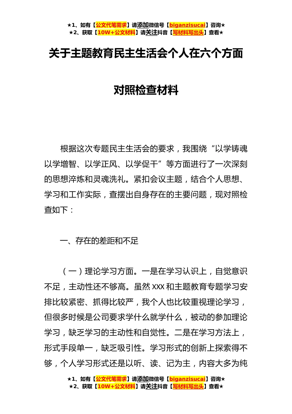 ★1、如有【公文代笔需求】请添加微信号【biganzisucai】咨询★★2、获取【10W+公文材料】请关注抖音【写材料写出头】查看★关于主题教育民主生活会个人在六个方面对照检查材料根据这次专题民主生活会的要求,我围绕“以学铸魂以学增智、以学正风、以学促干”等方面进行了一次深刻的思想淬炼和灵魂洗礼。紧扣会议主题,结合个人思想、学习和工作实际,查摆出自身存在的主要问题,现对照检查如下:一、存在的差距和不足(一)理论学习方面。一是在学习认识上,自觉意识不足,主动性还不够高。虽然XXX和主题教育专题学习安排比较紧密、抓得比较严,我个人也比较重视理论学习,但很多时候是公司要求学什么就学什么,被动的参加理论学习,缺乏学习的主动性和自觉性。二是在学习方法上,形式手段单一,缺乏吸引性。学习...