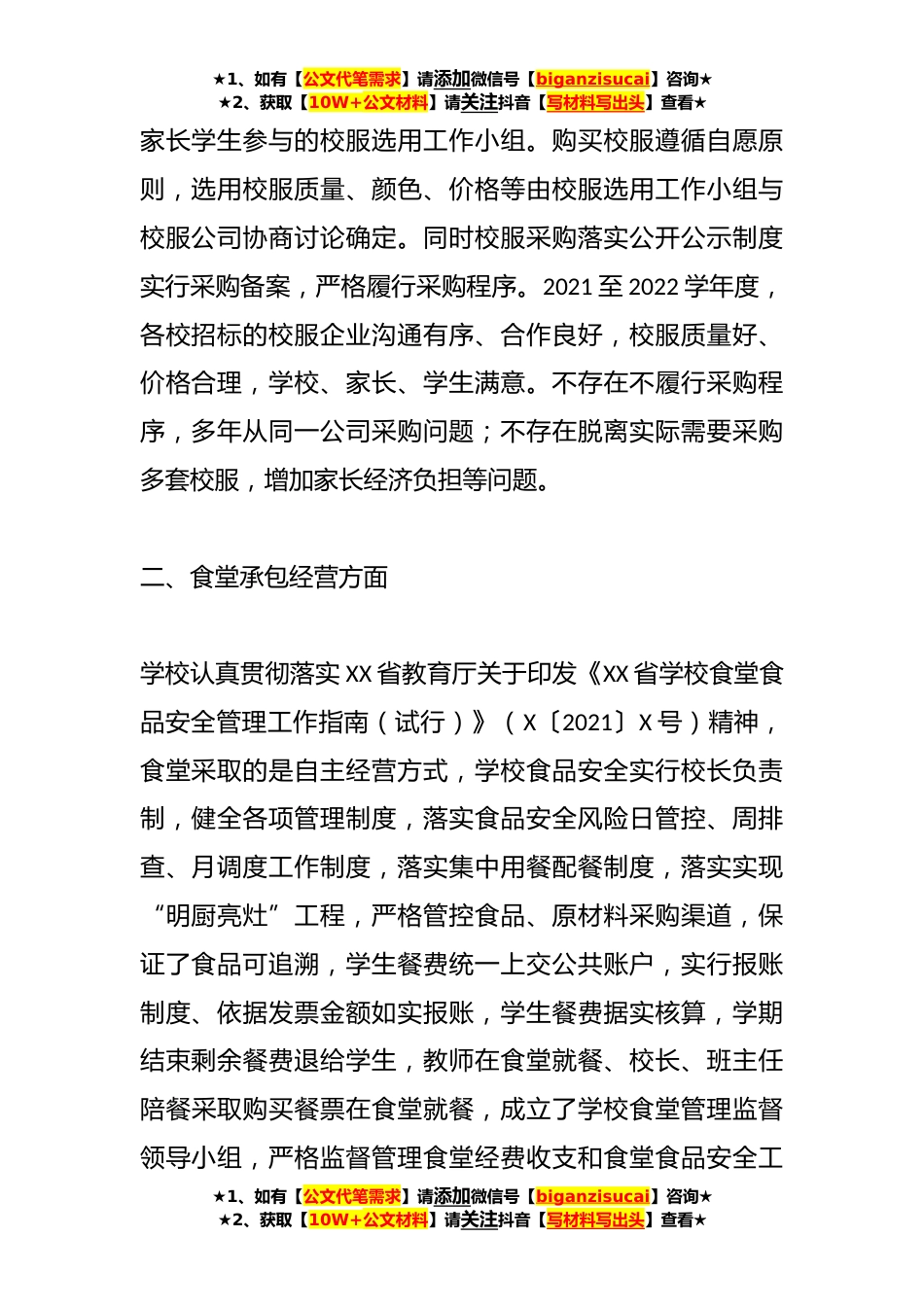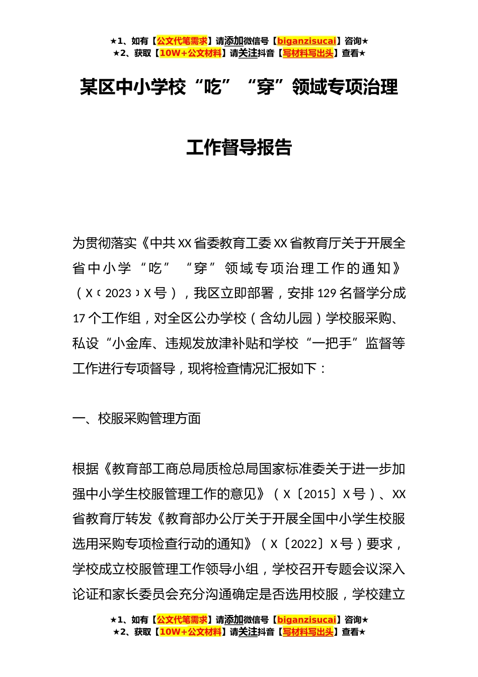 ★1、如有【公文代笔需求】请添加微信号【biganzisucai】咨询★★2、获取【10W+公文材料】请关注抖音【写材料写出头】查看★某区中小学校“吃”“穿”领域专项治理工作督导报告为贯彻落实《中共XX省委教育工委XX省教育厅关于开展全省中小学“吃”“穿”领域专项治理工作的通知》(X2023X﹝﹞号),我区立即部署,安排129名督学分成17个工作组,对全区公办学校(含幼儿园)学校服采购、私设“小金库、违规发放津补贴和学校“一把手”监督等工作进行专项督导,现将检查情况汇报如下:一、校服采购管理方面根据《教育部工商总局质检总局国家标准委关于进一步加强中小学生校服管理工作的意见》(X〔2015〕X号)、XX省教育厅转发《教育部办公厅关于开展全国中小学生校服选用采购专项检查行动的通知》(X〔2022〕X号)要...