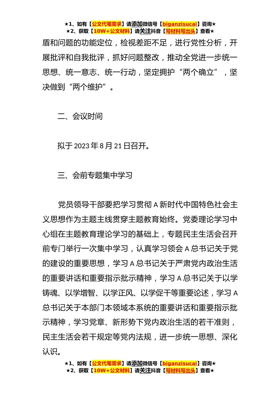 ★1、如有【公文代笔需求】请添加微信号【biganzisucai】咨询★★2、获取【10W+公文材料】请关注抖音【写材料写出头】查看★某国企党委在2023年主题教育专题民主生活会方案根据XX党委《关于转发〈中共中央纪委机关中共中央组织部中央学习贯彻A新时代中国特色社会主义思想主题教育领导小组关于在学习贯彻A新时代中国特色社会主义思想主题教育中开好专题民主生活会的通知〉的通知》有关要求,制定如下实施方案。一、会议主题紧紧围绕学习贯彻A新时代中国特色社会主义思想主题召开专题民主生活会,聚焦学思想、强党性、重实践、建新功总要求,对照凝心铸魂筑牢根本、锤炼品格强化忠诚、实干担当促进发展、践行宗旨为民造福、廉洁奉公树立新风的具体目标,深入学习领悟以学铸魂、以学增智、以学正风、以学促干的丰富内...