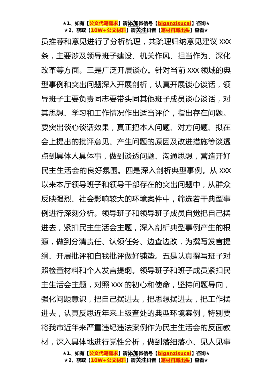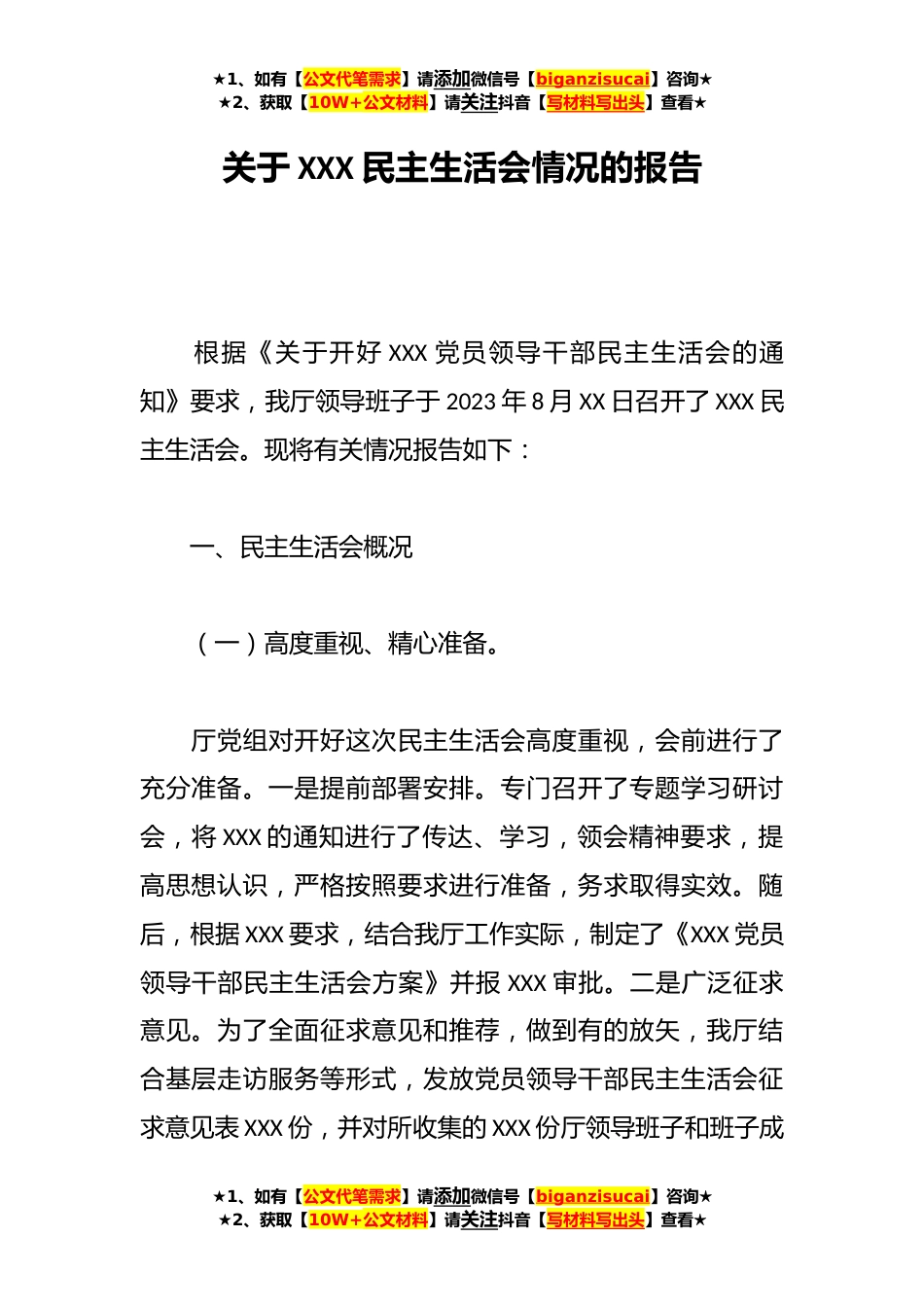 ★1、如有【公文代笔需求】请添加微信号【biganzisucai】咨询★★2、获取【10W+公文材料】请关注抖音【写材料写出头】查看★关于XXX民主生活会情况的报告根据《关于开好XXX党员领导干部民主生活会的通知》要求,我厅领导班子于2023年8月XX日召开了XXX民主生活会。现将有关情况报告如下:一、民主生活会概况(一)高度重视、精心准备。厅党组对开好这次民主生活会高度重视,会前进行了充分准备。一是提前部署安排。专门召开了专题学习研讨会,将XXX的通知进行了传达、学习,领会精神要求,提高思想认识,严格按照要求进行准备,务求取得实效。随后,根据XXX要求,结合我厅工作实际,制定了《XXX党员领导干部民主生活会方案》并报XXX审批。二是广泛征求意见。为了全面征求意见和推荐,做到有的放矢,我厅结合基层走...