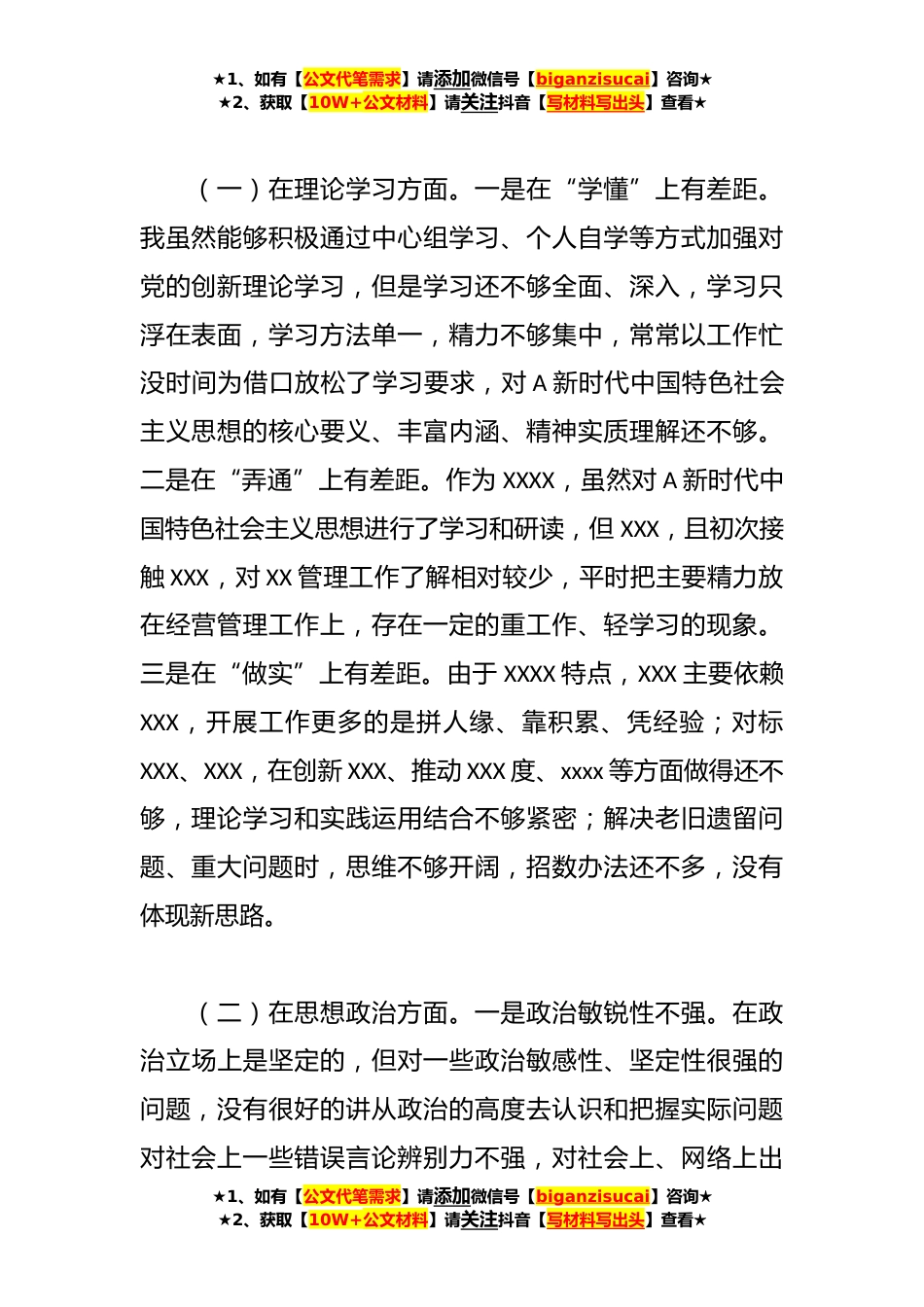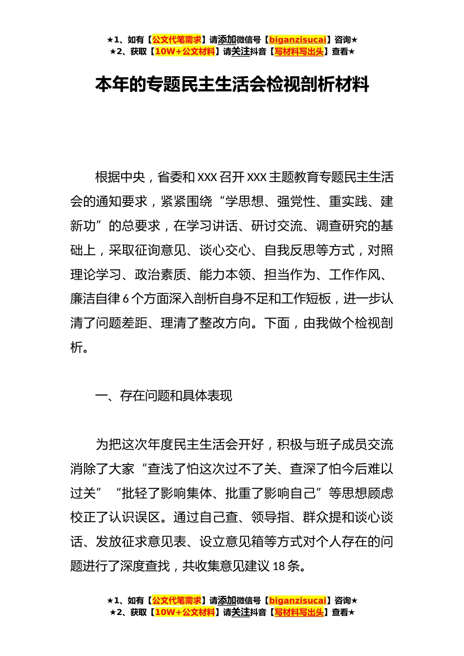 ★1、如有【公文代笔需求】请添加微信号【biganzisucai】咨询★★2、获取【10W+公文材料】请关注抖音【写材料写出头】查看★本年的专题民主生活会检视剖析材料根据中央,省委和XXX召开XXX主题教育专题民主生活会的通知要求,紧紧围绕“学思想、强党性、重实践、建新功”的总要求,在学习讲话、研讨交流、调查研究的基础上,采取征询意见、谈心交心、自我反思等方式,对照理论学习、政治素质、能力本领、担当作为、工作作风、廉洁自律6个方面深入剖析自身不足和工作短板,进一步认清了问题差距、理清了整改方向。下面,由我做个检视剖析。一、存在问题和具体表现为把这次年度民主生活会开好,积极与班子成员交流消除了大家“查浅了怕这次过不了关、查深了怕今后难以过关”“批轻了影响集体、批重了影响自己”等思想...