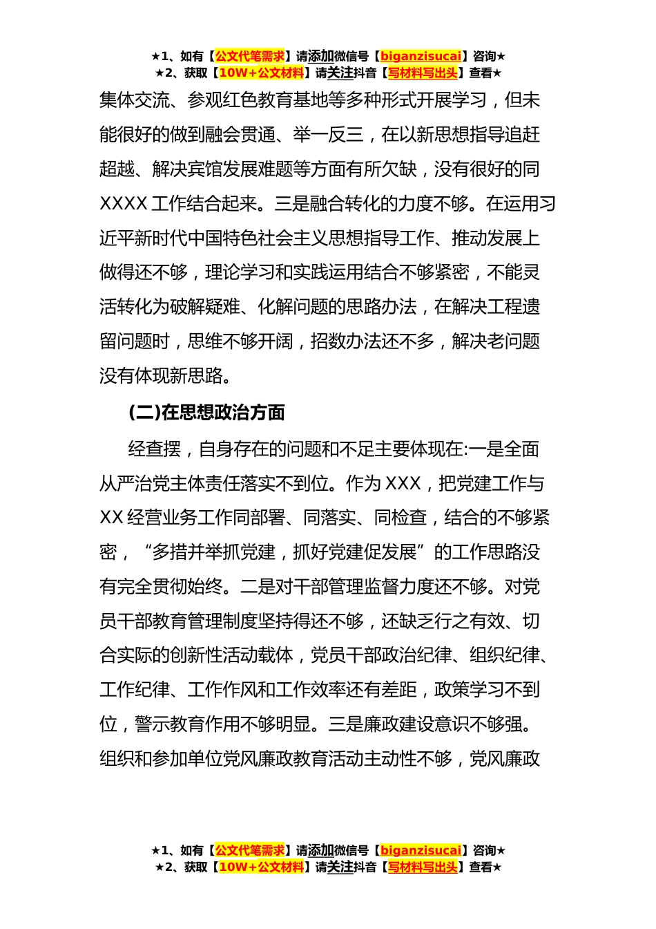 ★1、如有【公文代笔需求】请添加微信号【biganzisucai】咨询★★2、获取【10W+公文材料】请关注抖音【写材料写出头】查看★2023年专题民主生活会检视剖析材料根据XXX《关于开展xxx主题教育实施方案》要求,结合XXX工作实际,在深入学习习近平新时代中国特色社会主义思想、广泛征求意见、深入谈心谈话、梳理检视问题的基础上,对照理论学习、政治素质、能力本领、担当作为、工作作风、廉洁自律等6个方面突出问题、12条具体要求,坚持把自己摆进去、把工作摆进去、把职责摆进去,认真梳理查摆问题,现自我检视剖析如下:一、存在的问题按照XXXX的统一安排部署,会前,认真学习了习近平新时代中国特色社会主义思想,认真研读了《XXXX》《XXX学习纲要》,以及XXXX主题教育工作要求,并结合个人思想和工作实际,认真检查...