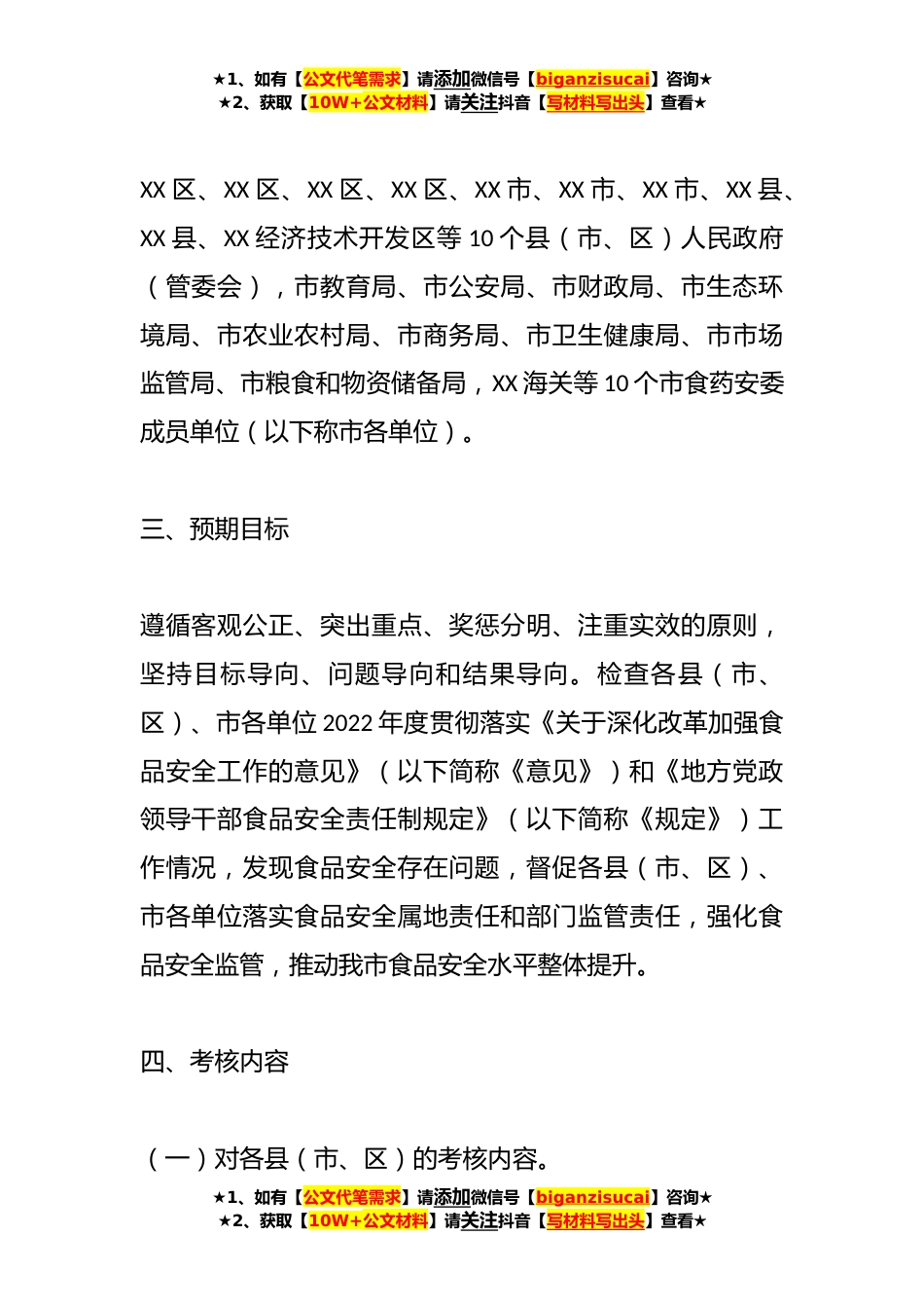 ★1、如有【公文代笔需求】请添加微信号【biganzisucai】咨询★★2、获取【10W+公文材料】请关注抖音【写材料写出头】查看★202X年某市食品安全工作评议考核实施方案为认真贯彻党中央、国务院关于食品安全工作的决策部署落实省委、省政府、市委、市政府有关工作要求,客观评价各县(市、区)、市食药安委成员单位食品安全工作情况,根据《XX市2022年督查检查考核计划》要求,制定本方案。一、考核依据(一)《中华人民共和国食品安全法》;(二)《XX省人民政府办公厅关于印发XX省食品安全工作评议考核办法的通知》(X府办〔2016〕121号)。二、考核对象★1、如有【公文代笔需求】请添加微信号【biganzisucai】咨询★★2、获取【10W+公文材料】请关注抖音【写材料写出头】查看★★1、如有【公文代笔需求】请添加微...