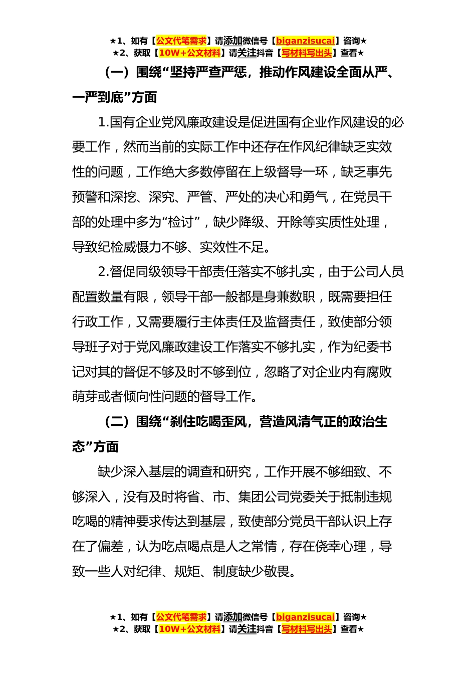 ★1、如有【公文代笔需求】请添加微信号【biganzisucai】咨询★★2、获取【10W+公文材料】请关注抖音【写材料写出头】查看★公司纪委书记“以案促改”作风建设专项大讨论个人对照检查材料(3367字)一、充分认识开展“以案促改”作风建设工作的重要性和紧迫性情况党风廉政建设和反腐败工作是国有企业全面从严治党的重要内容。近年来,公司围绕中心工作,坚持惩防并举、注重预防,在保持反腐败高压态势的同时,预防腐败“工作取得了明显的成效。习近平总书记曾在讲话中提出标”本兼治、以治标促进治本的要求,坚持标本兼治推进以案促改工作,不断以治标促进治本,是摆在我们面前重要而紧迫的任务,对于源头预防治腐、营造风清气正环境、促进干部干事创业十分必要。要深刻认识到以案促改的意“”义,从讲政治的高度...