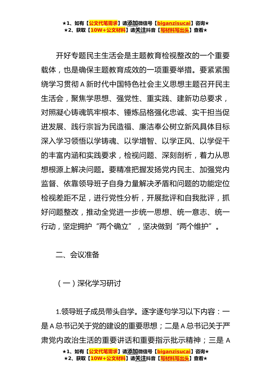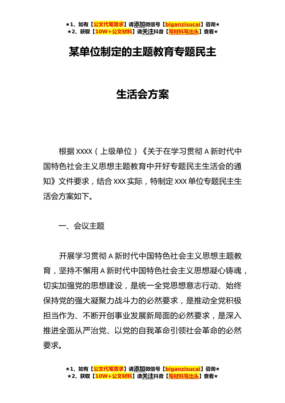 ★1、如有【公文代笔需求】请添加微信号【biganzisucai】咨询★★2、获取【10W+公文材料】请关注抖音【写材料写出头】查看★某单位制定的主题教育专题民主生活会方案根据XXXX(上级单位)《关于在学习贯彻A新时代中国特色社会主义思想主题教育中开好专题民主生活会的通知》文件要求,结合XXX实际,特制定XXX单位专题民主生活会方案如下。一、会议主题开展学习贯彻A新时代中国特色社会主义思想主题教育,坚持不懈用A新时代中国特色社会主义思想凝心铸魂,切实加强党的思想建设,是统一全党思想意志行动、始终保持党的强大凝聚力战斗力的必然要求,是推动全党积极担当作为、不断开创事业发展新局面的必然要求,是深入推进全面从严治党、以党的自我革命引领社会革命的必然要求。★1、如有【公文代笔需求】请添加微信...