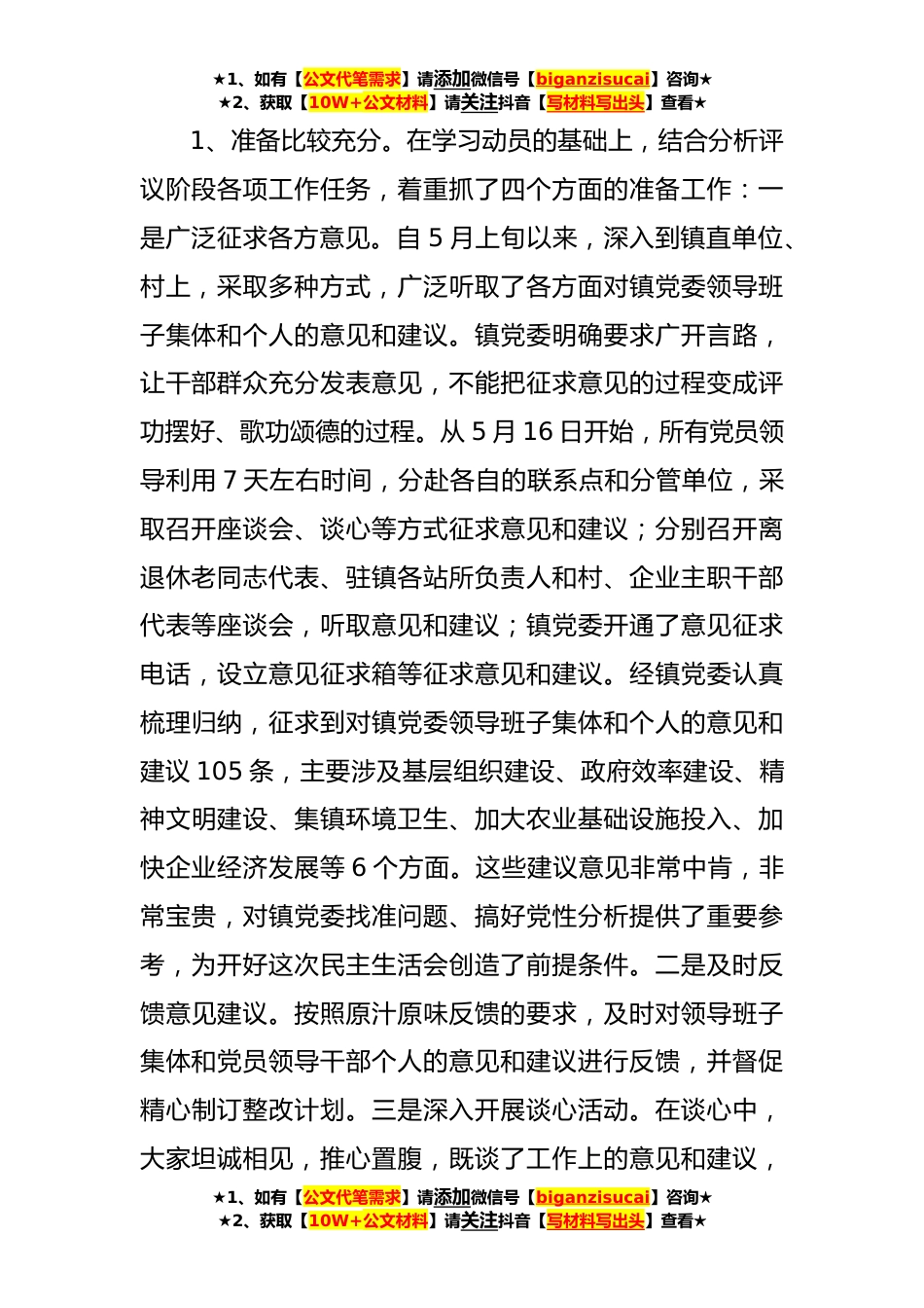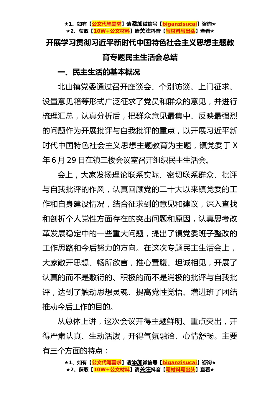 ★1、如有【公文代笔需求】请添加微信号【biganzisucai】咨询★★2、获取【10W+公文材料】请关注抖音【写材料写出头】查看★开展学习贯彻习近平新时代中国特色社会主义思想主题教育专题民主生活会总结一、民主生活的基本概况北山镇党委通过召开座谈会、个别访谈、上门征求、设置意见箱等形式广泛征求了党员和群众的意见,并进行梳理汇总,认真分析后,把群众意见最集中、反映最强烈的问题作为开展批评与自我批评的重点,以开展习近平新时代中国特色社会主义思想主题教育为主题,镇党委于X年6月29日在镇三楼会议室召开组织民主生活会。会上,大家发扬理论联系实际、密切联系群众、批评与自我批评的作风,认真回顾党的二十大以来镇党委的工作和自身建设情况,结合征求到的意见和建议,深入查找和剖析个人党性方面存...