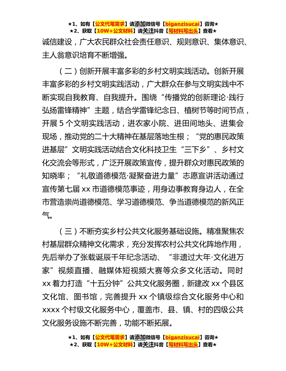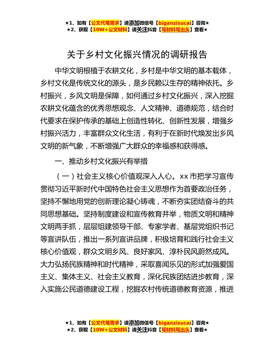 ★1、如有【公文代笔需求】请添加微信号【biganzisucai】咨询★★2、获取【10W+公文材料】请关注抖音【写材料写出头】查看★关于乡村文化振兴情况的调研报告中华文明根植于农耕文化,乡村是中华文明的基本载体,乡村文化是传统文化的源头,是乡民赖以生存的精神依托。乡村振兴,乡风文明是保障,如何通过乡村文化振兴,深入挖掘农耕文化蕴含的优秀思想观念、人文精神、道德规范,结合时代要求在保护传承的基础上创造性转化、创新性发展,增强乡村振兴活力,丰富群众文化生活,有利于在新时代焕发出乡风文明的新气象,不断增强广大群众的幸福感和获得感。一、推动乡村文化振兴有举措(一)社会主义核心价值观深入人心。xx市把学习宣传贯彻习近平新时代中国特色社会主义思想作为首要政治任务,坚持不懈地用党的创新...