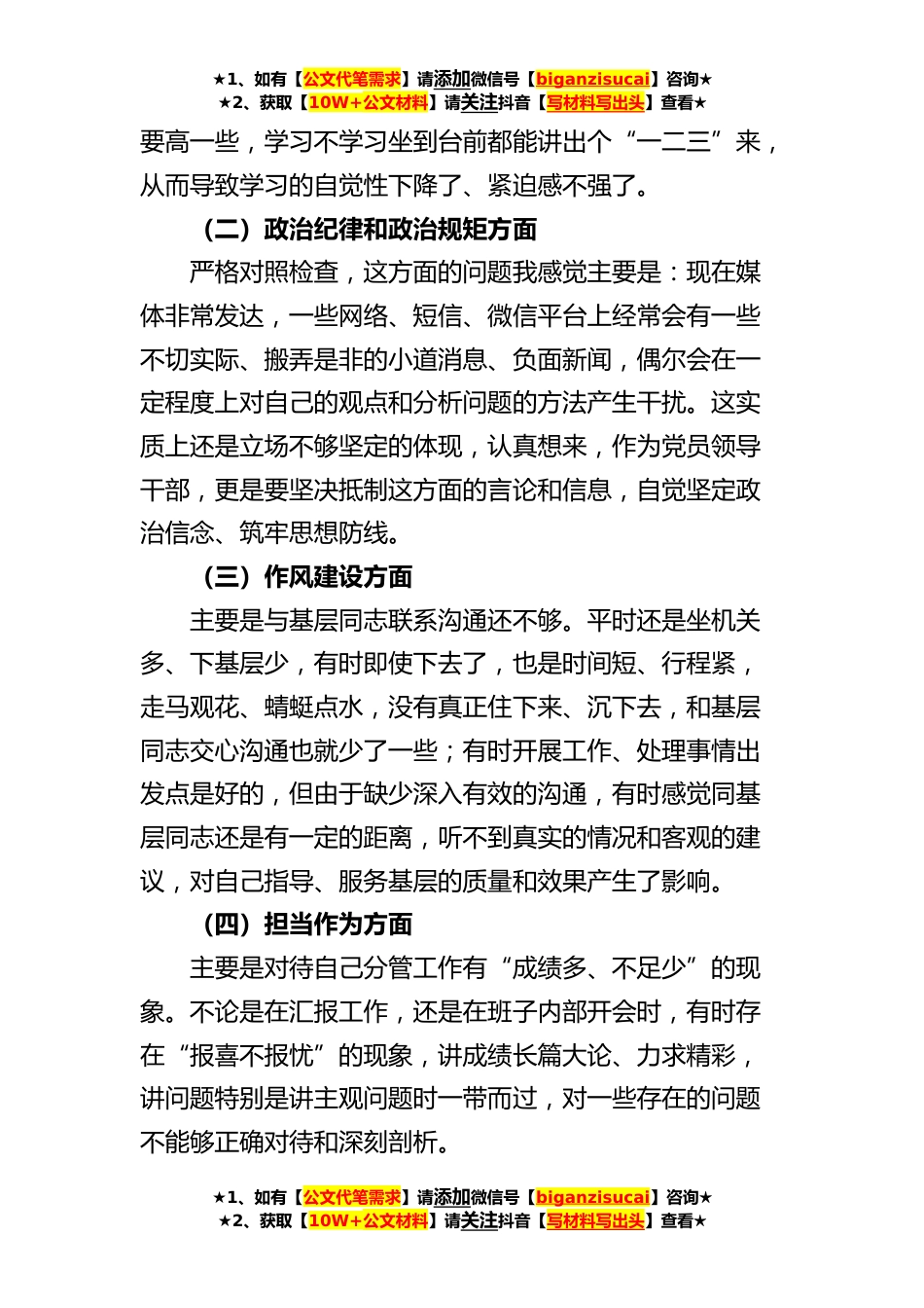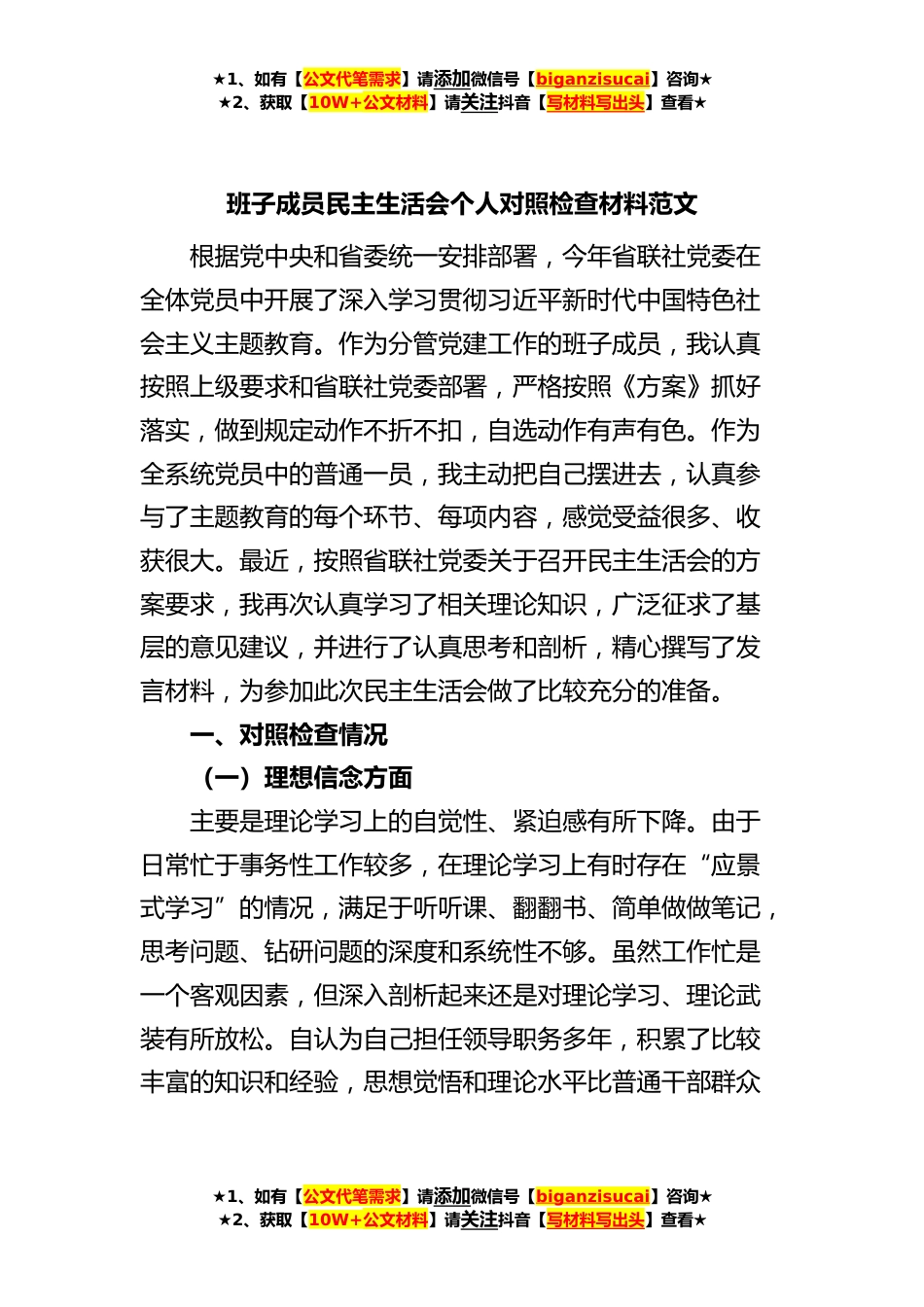 ★1、如有【公文代笔需求】请添加微信号【biganzisucai】咨询★★2、获取【10W+公文材料】请关注抖音【写材料写出头】查看★班子成员民主生活会个人对照检查材料范文根据党中央和省委统一安排部署,今年省联社党委在全体党员中开展了深入学习贯彻习近平新时代中国特色社会主义主题教育。作为分管党建工作的班子成员,我认真按照上级要求和省联社党委部署,严格按照《方案》抓好落实,做到规定动作不折不扣,自选动作有声有色。作为全系统党员中的普通一员,我主动把自己摆进去,认真参与了主题教育的每个环节、每项内容,感觉受益很多、收获很大。最近,按照省联社党委关于召开民主生活会的方案要求,我再次认真学习了相关理论知识,广泛征求了基层的意见建议,并进行了认真思考和剖析,精心撰写了发言材料,为参...